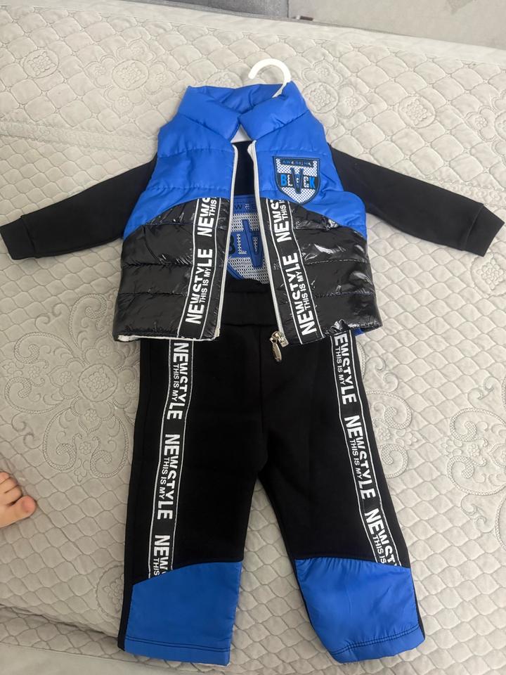 Комплект состоит из кофты с длинным рукавом, тёплого жилета и брюк. Жилет выполнен в ярком синем и чёрном цветах. Артикул: 558969