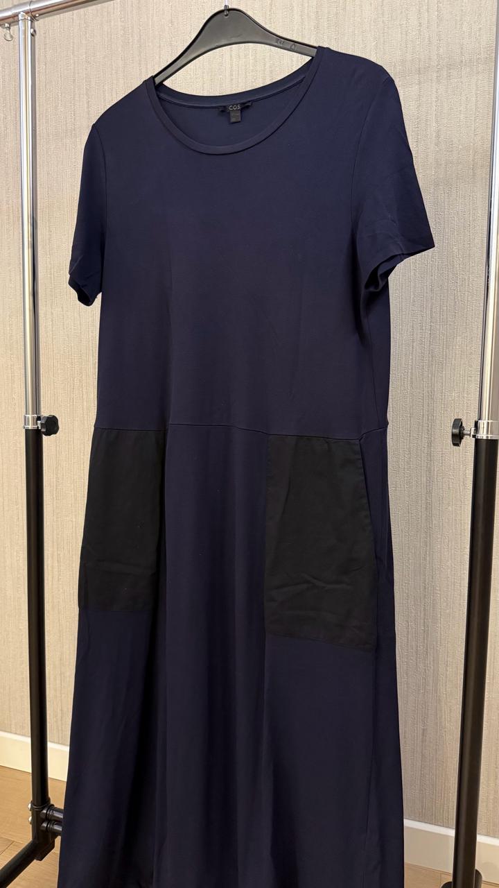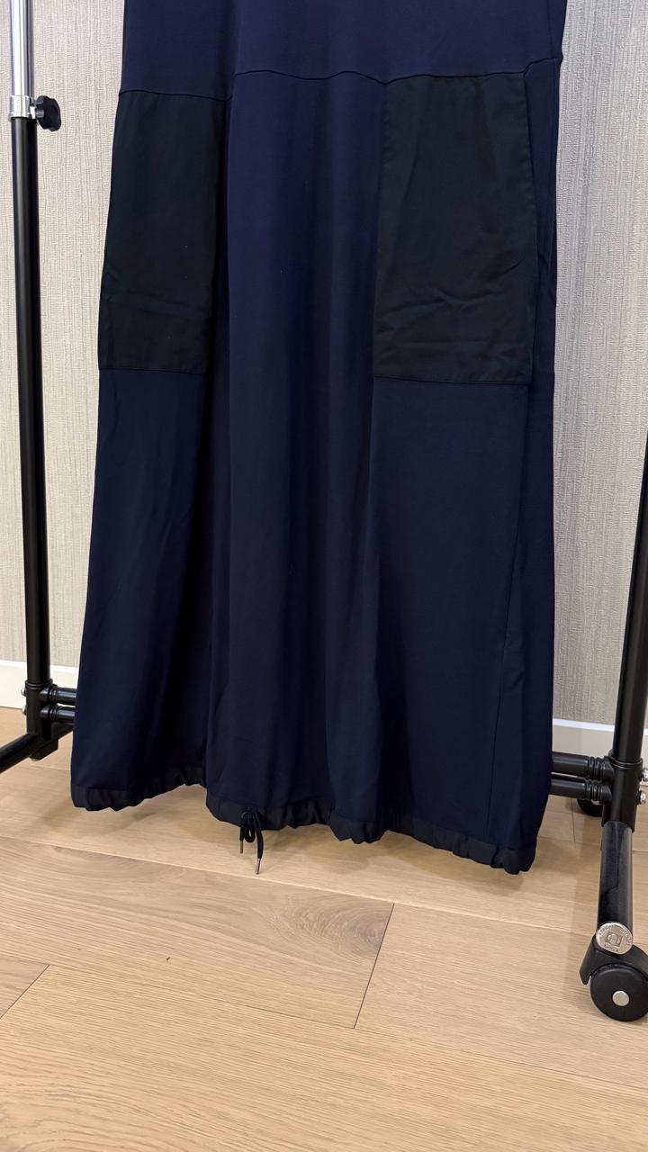 Платье в темно синем цвете. Есть карманы. По низу платья можно затянуть и поменять фасон. Артикул: 559002
