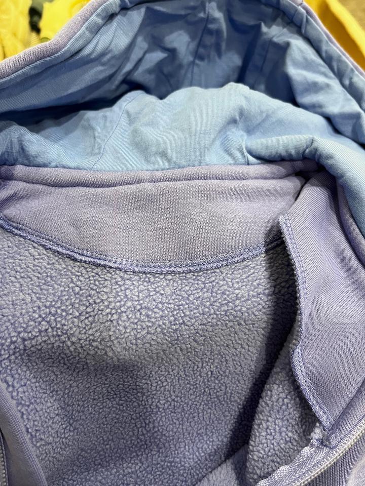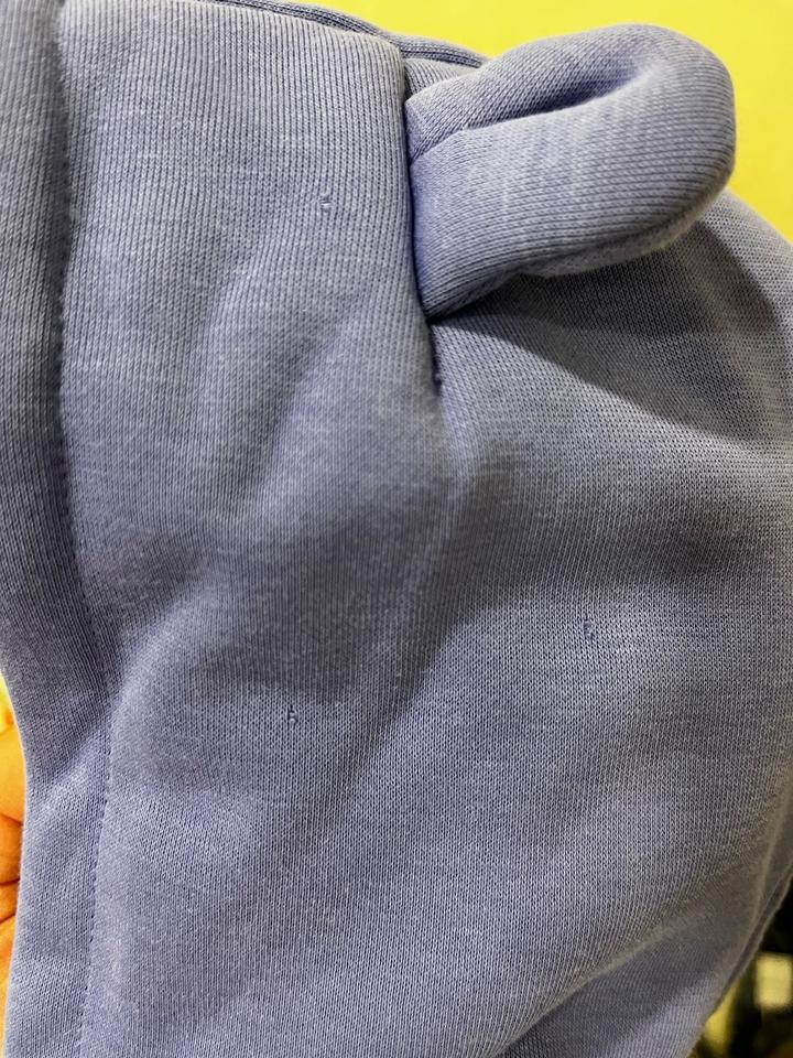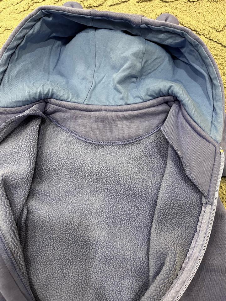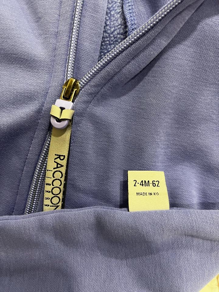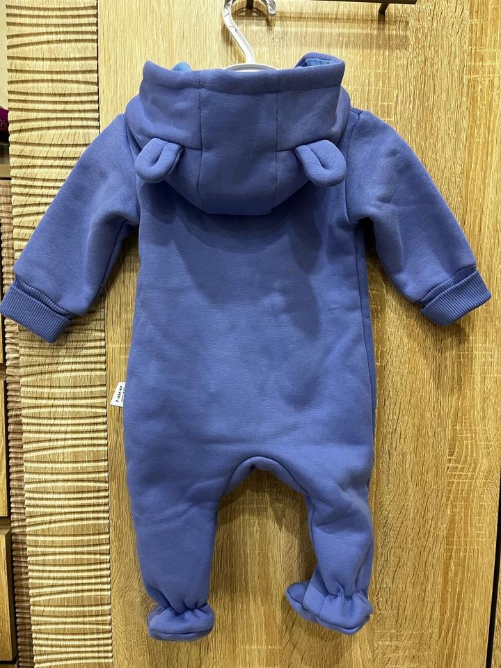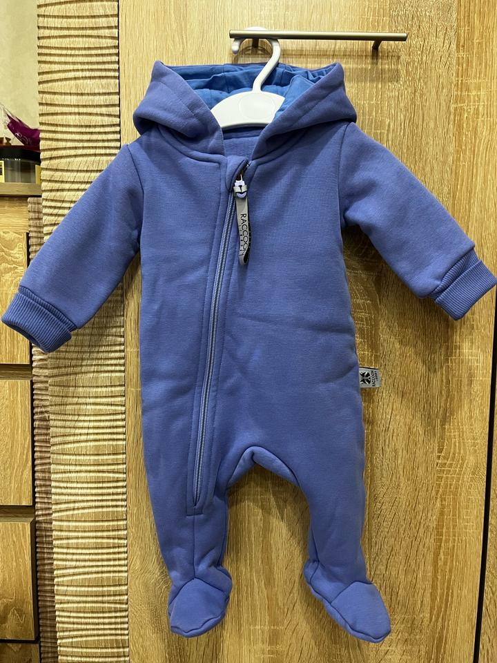 Утепленный комбинезон из футера с флисовым начесом. Размер 62 (от 2 до 4 месяцев). Очень мягкий, флис не скатаный. Приятный цвет, между синим и фиолетовым, ближе к лавандовому. Одевали всего пару раз. На капюшоне имеется изначальный брак, пропущены три петли. Артикул: 559064