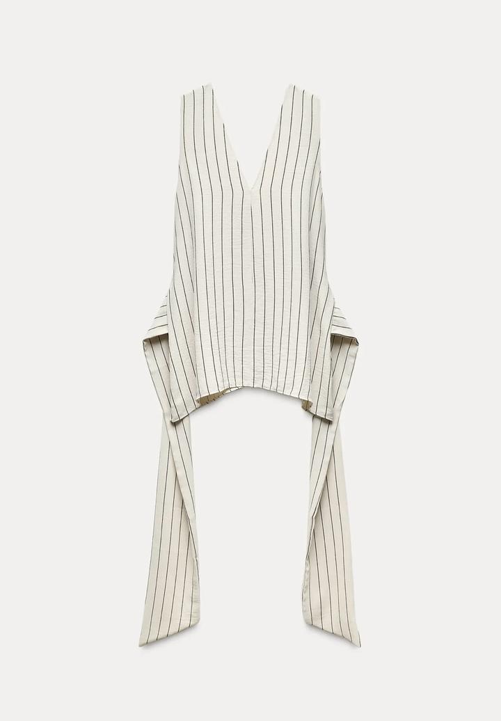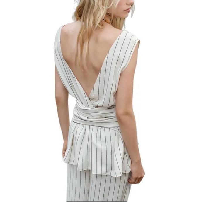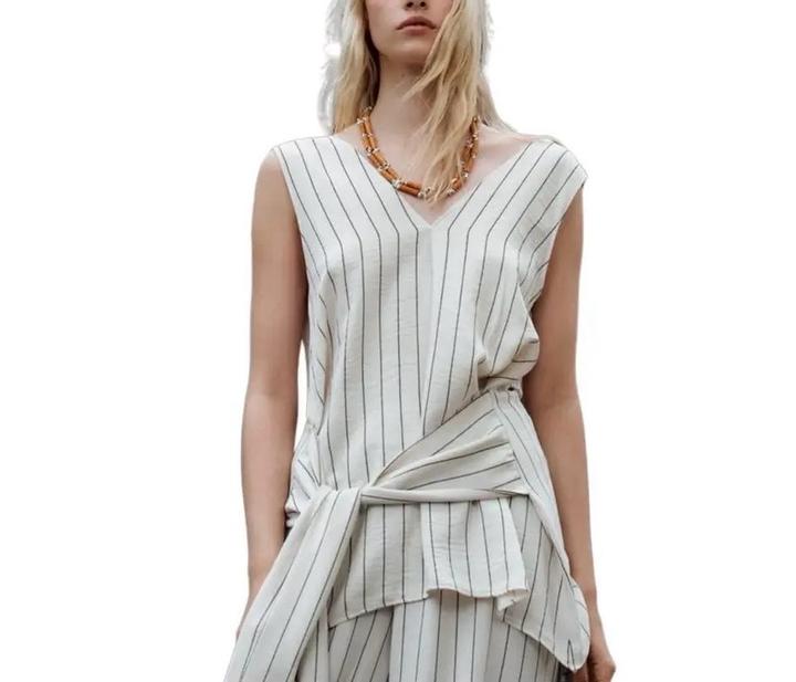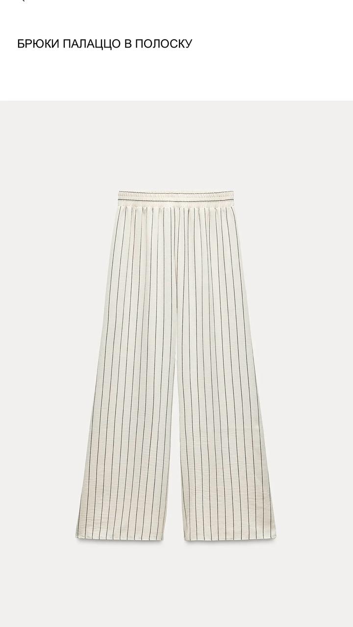 Костюм Zara в тонкую полоску: свободный топ с глубоким вырезом и длинными завязками (можно завязывать по-разному) + широкие брюки палаццо на резинке. Лёгкая струящаяся ткань, вытягивает силуэт. Стильно, комфортно и универсально. Артикул: 559245