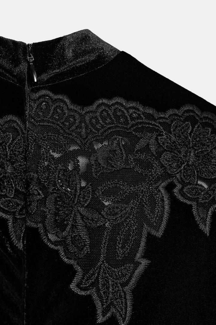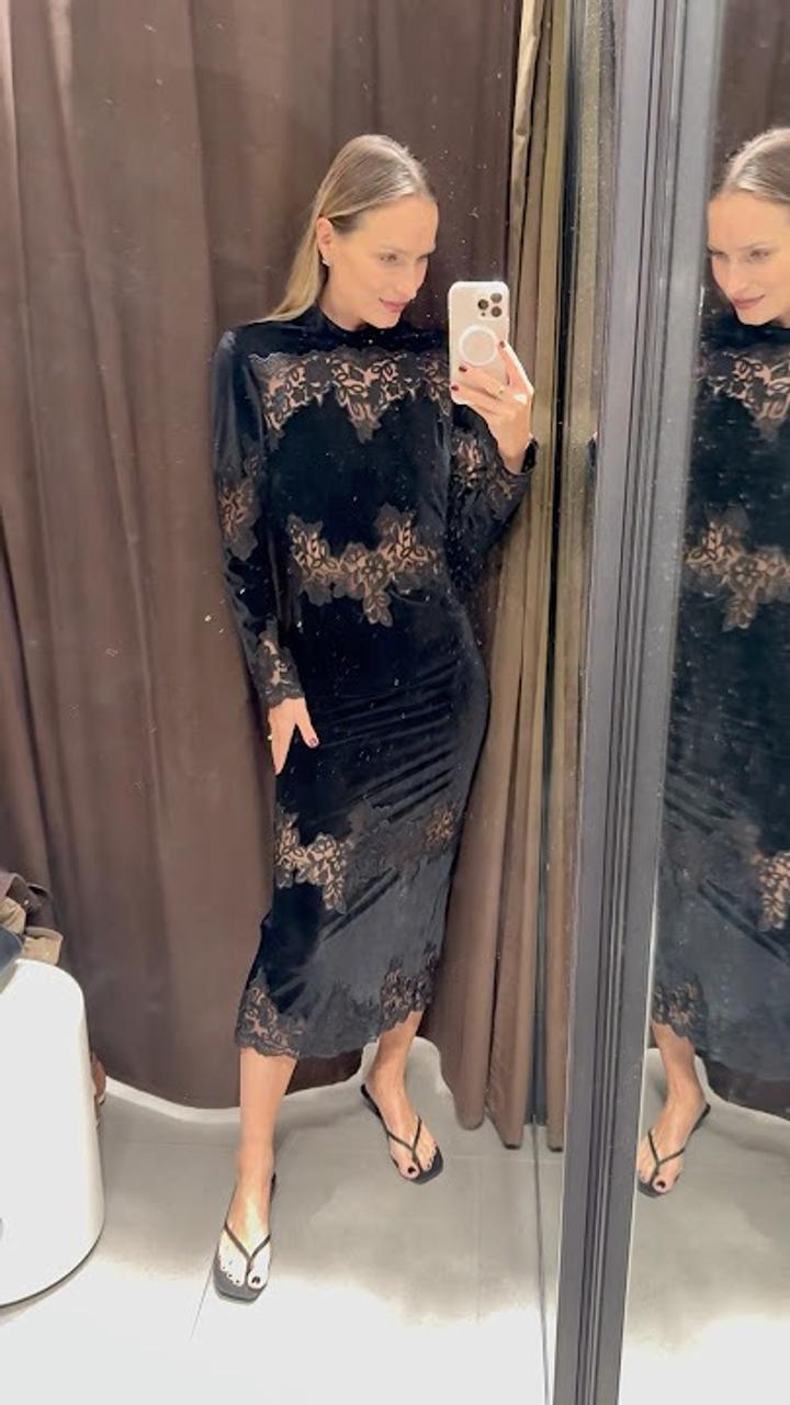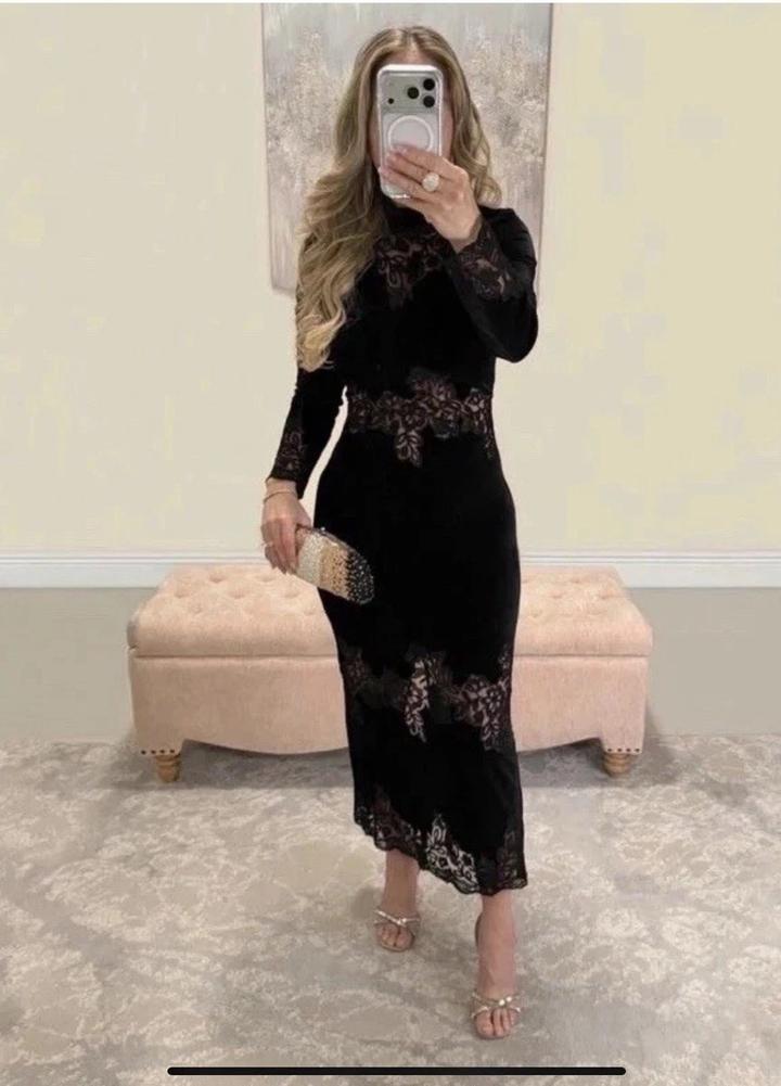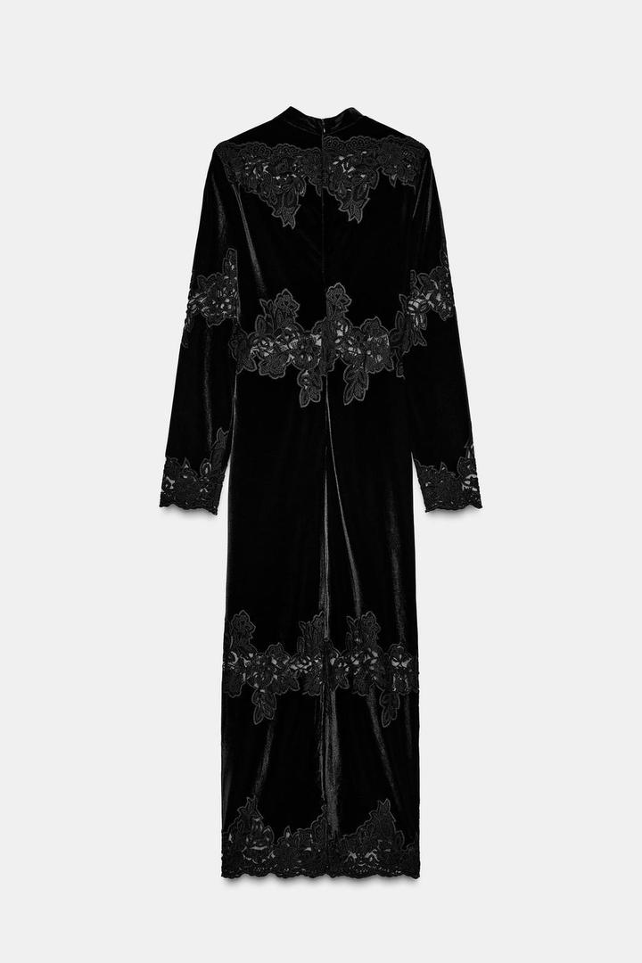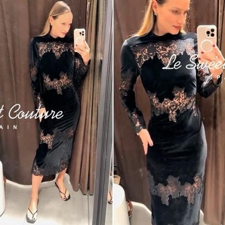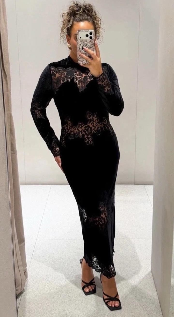 Платье закрытое по самое горло, при этом подчёркивающее и обнажающее самое интересное, выполнено из бархата и кружева Хорошо подойдёт на S и на стройную M Артикул: 559408