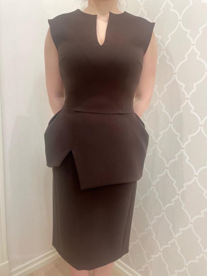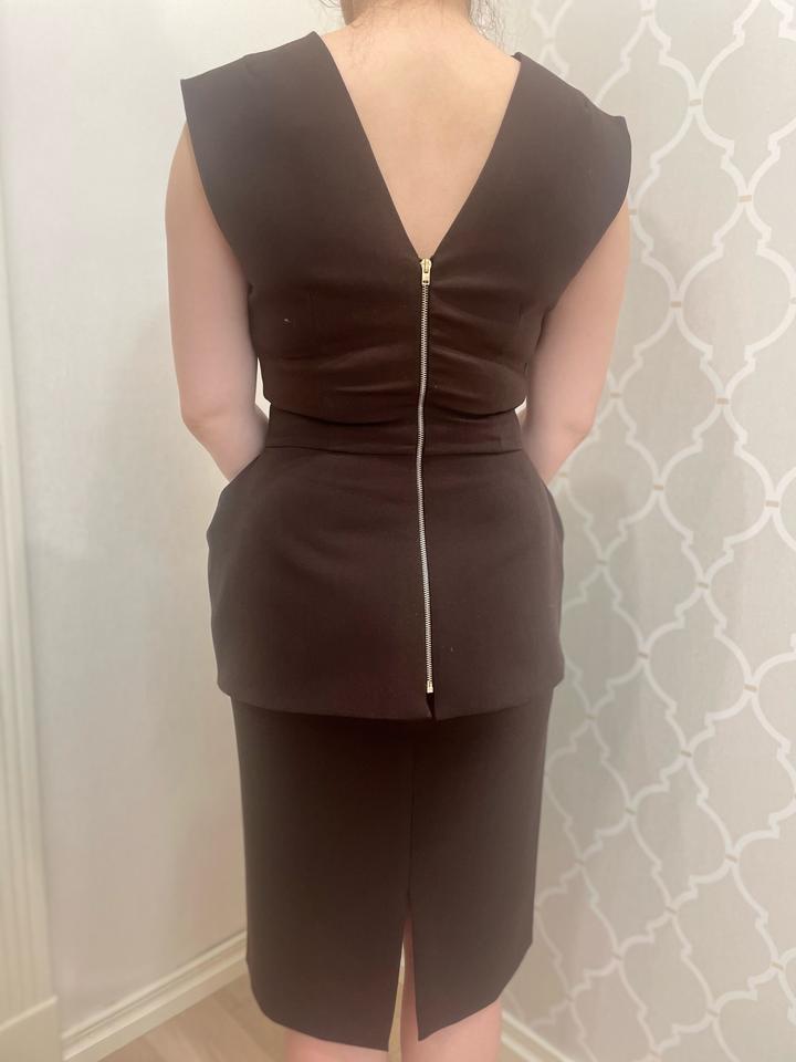 Костюм из шикарной костюмной ткани цвета шоколад. Юбка карандаш, сзади шлица и замочек. Жилет с баской, золотистым замком сзади, приталенный. Костюм создает идеальный силуэт и подчеркивает фигуру, баска скрывает «животик». Артикул: 559643