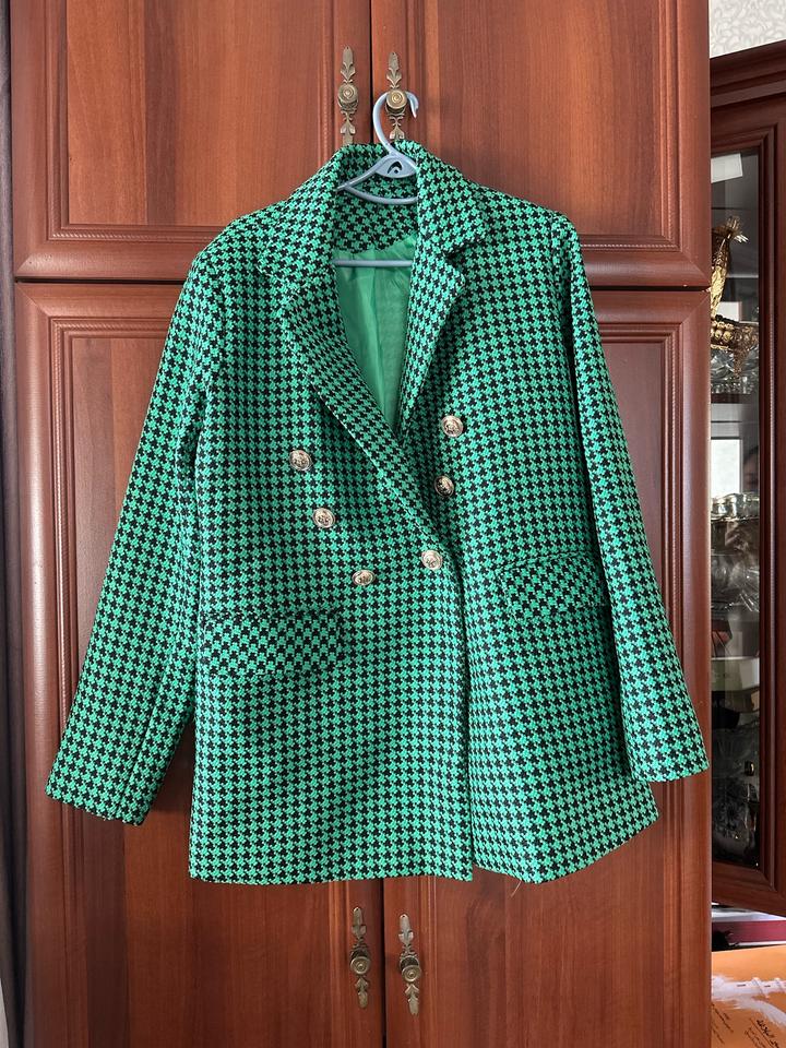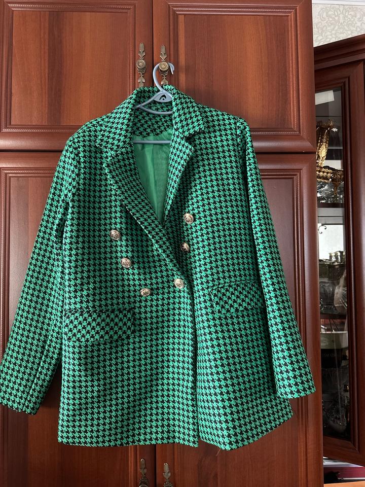 Удлиненный двубортный жакет в клетку: • Цвет: Ярко-зеленый / Черный. • Принт: Классический Houndstooth (гусиная лапка). • Детали: Прямой крой, широкие лацканы, декоративные золотистые пуговицы с тиснением, прорезные карманы с клапанами. • Особенности: Подкладка в тон изделия обеспечивает комфортную посадку и держит форму. • Стиль: Business casual, street style. Артикул: 559656