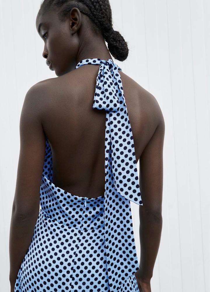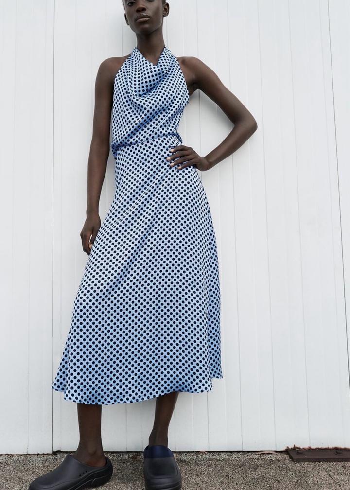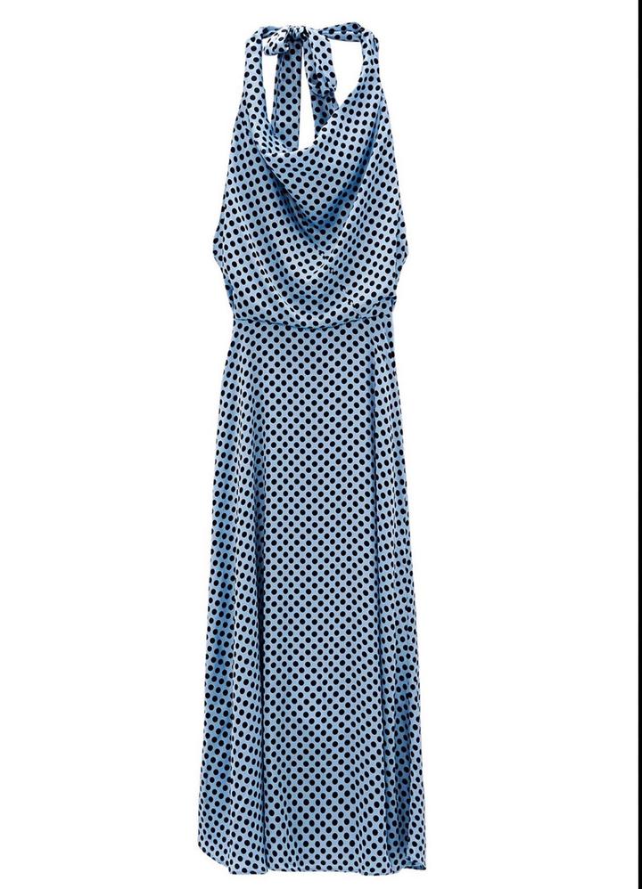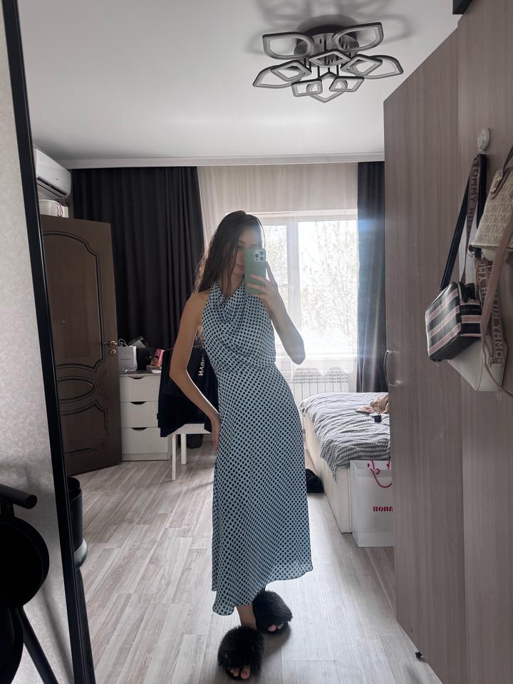 Длинное атласное платье в горошек Цвет:Голубой Размер:S/M Артикул: 559726