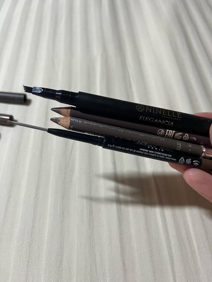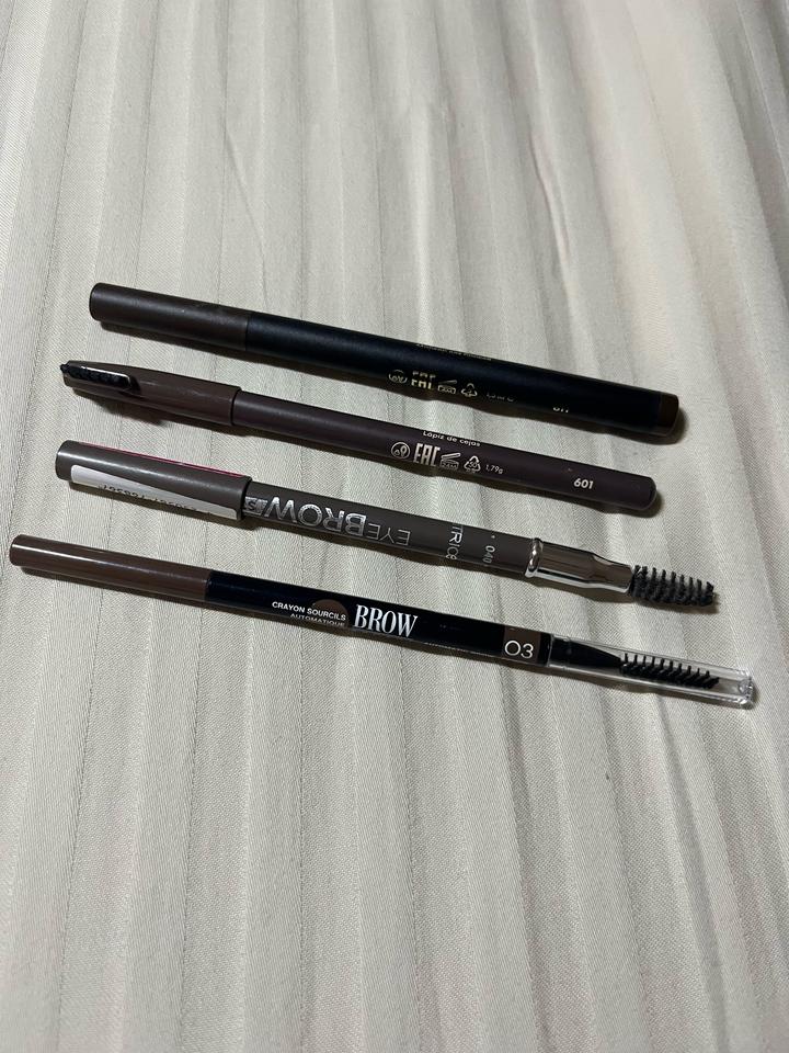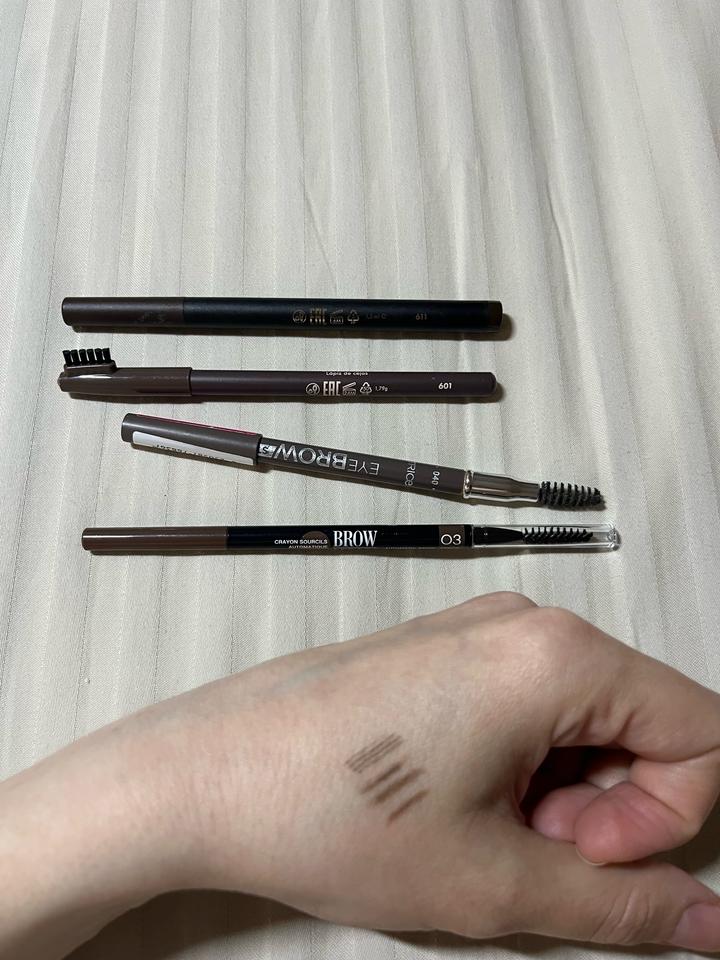 Карандаши и маркер для бровей темненьких (шатенки, брюнетки) На руке оттенки сверху вниз: Маркер для бровей Ninelle 611 Карандаш Ninelle Manera 601 Карандаш Catrice 040 Карандаш Vivienne Sabo 03 Кроме Catrice (остаток более 90%), остальные средства новые. Артикул: 560207