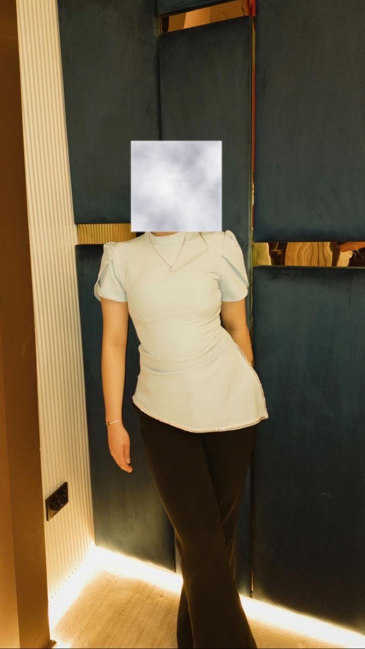 Голубая очень красивая кофта 44 размера. Без дефектов. Сидит по фигуре. Сзади на завязках. Внизу стразы. Артикул: 560676