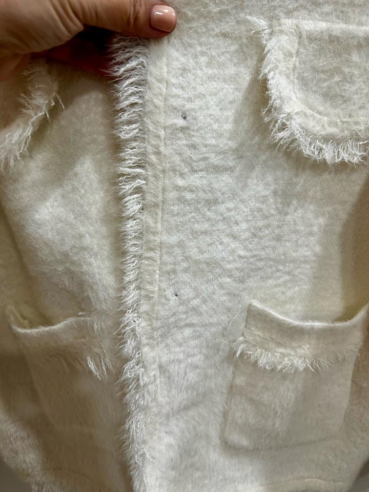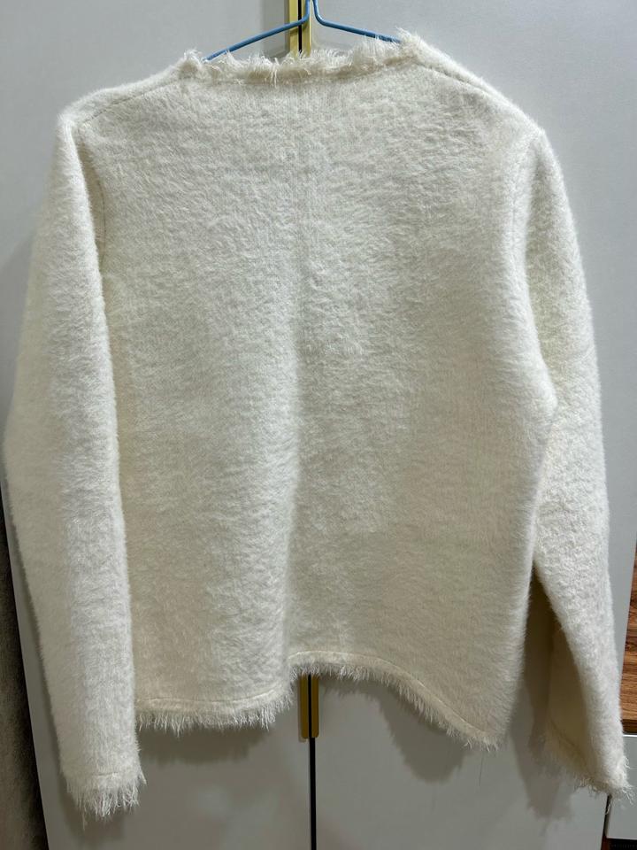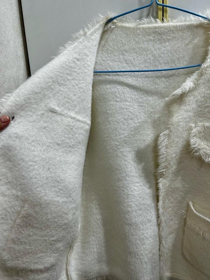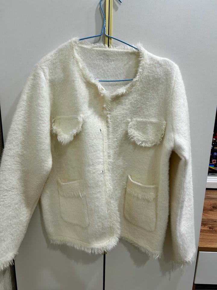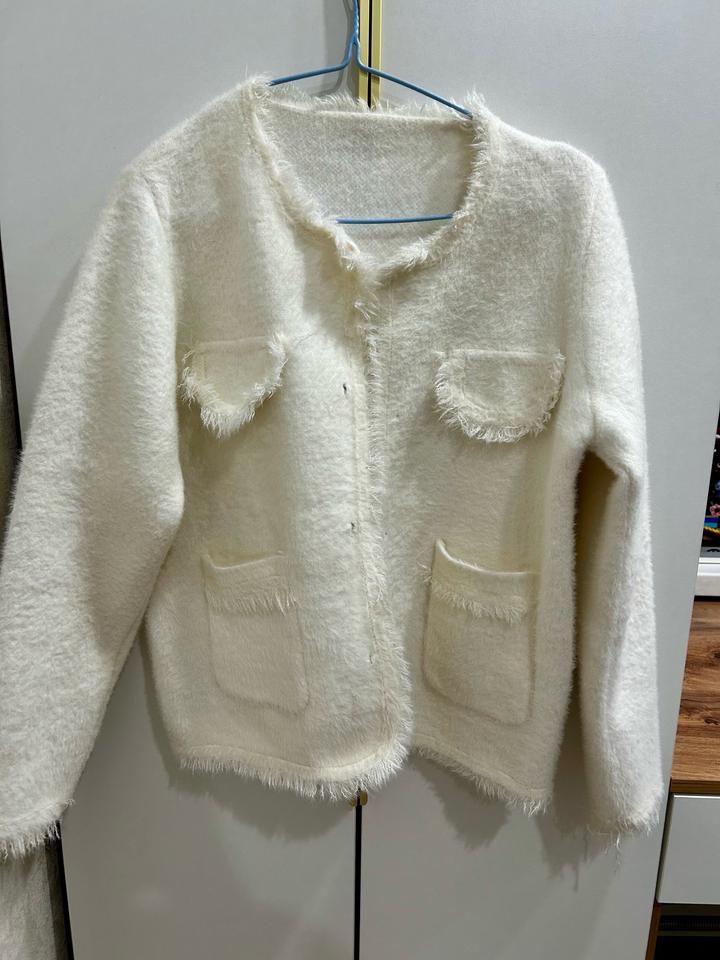 Кофточка, есть нюанс убрала пуговицы остались точки, их не видно, одела 1 раз оказалась маленькой, цвет молочный, до 46 Артикул: 560813