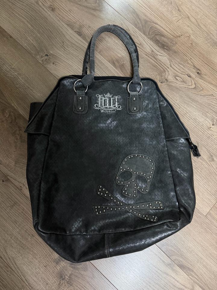 Архивная сумка-тоут MCJH & TWJ в эстетике Cyber Gothic и Grunge. Модель выполнена из плотной эко-кожи с фактурным плетением под карбон, что придает аксессуару футуристичный и износостойкий вид. Главный акцент — крупная аппликация в виде черепа с костями Артикул: 561301