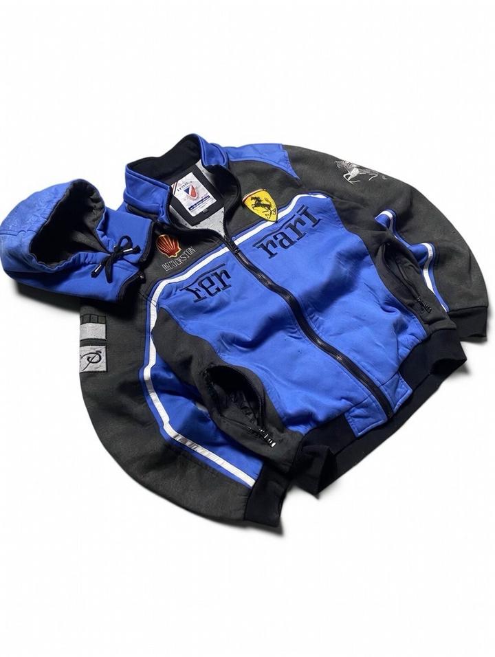 Это яркая винтажная куртка в спортивном стиле с выраженной автотематикой, вдохновлённой брендом Ferrari. Основной цвет — насыщенный синий, дополненный чёрными вставками на рукавах и плечах. По всей куртке проходят белые контрастные линии, которые подчёркивают силуэт и придают динамичный вид. На груди расположен крупный текстовый принт «Ferrari», разделённый молнией. Артикул: 561365