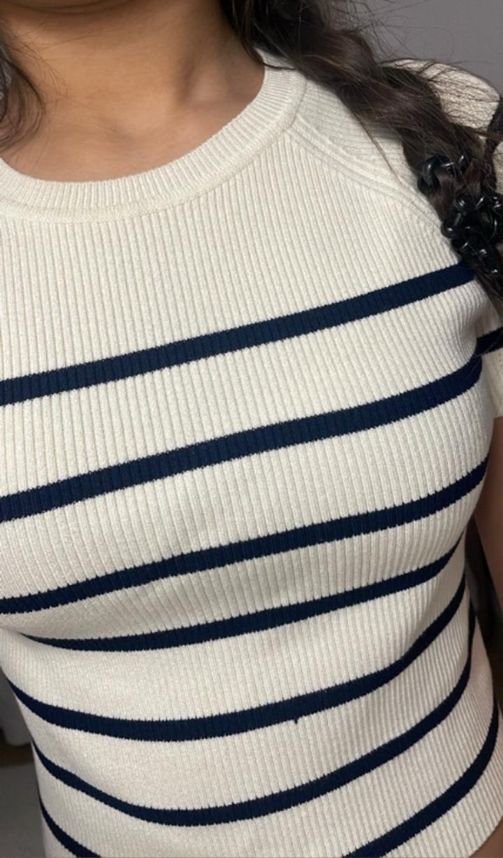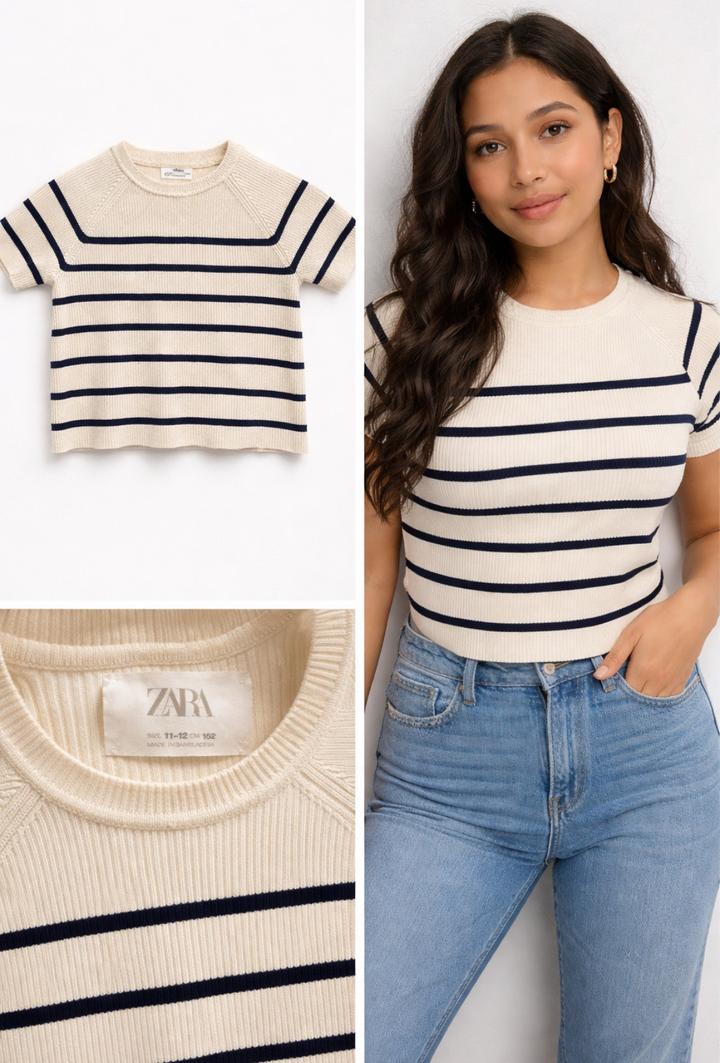 Футболка ZARA в полоску 🤍 Размер: 11–12 лет (152), подойдёт и на XS Очень стильная базовая модель — молочный цвет с тёмно-синими полосками. Классно сидит по фигуре за счёт рубчика, хорошо тянется и подчёркивает силуэт. Состояние отличное, без пятен и дефектов. Надевалась несколько раз. Подойдёт под джинсы, юбки, шорты — универсальная вещь на каждый день 🌿 📍Причина продажи: стала мала Артикул: 561417