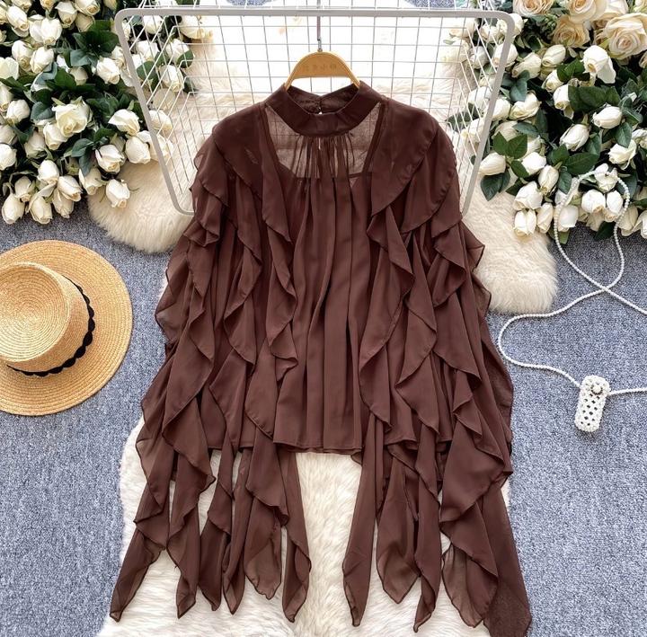 Воздушная и лёгкая модель с эффектными многослойными воланами. Свободный крой красиво струится по фигуре, создавая женственный и утончённый образ. Полупрозрачная ткань добавляет нежности и изысканности. Цвет: глубокий шоколадный 🔹 Ткань: лёгкий шифон 🔹 Крой: свободный, летящий 🔹 Детали: многослойные воланы, высокий ворот 🔹 Идеально для: фотосессий, мероприятий, стильных образов Смотрится дорого и необычно. Подойдёт тем, кто любит эффектные и романтичные вещи ✨ Артикул: 561475