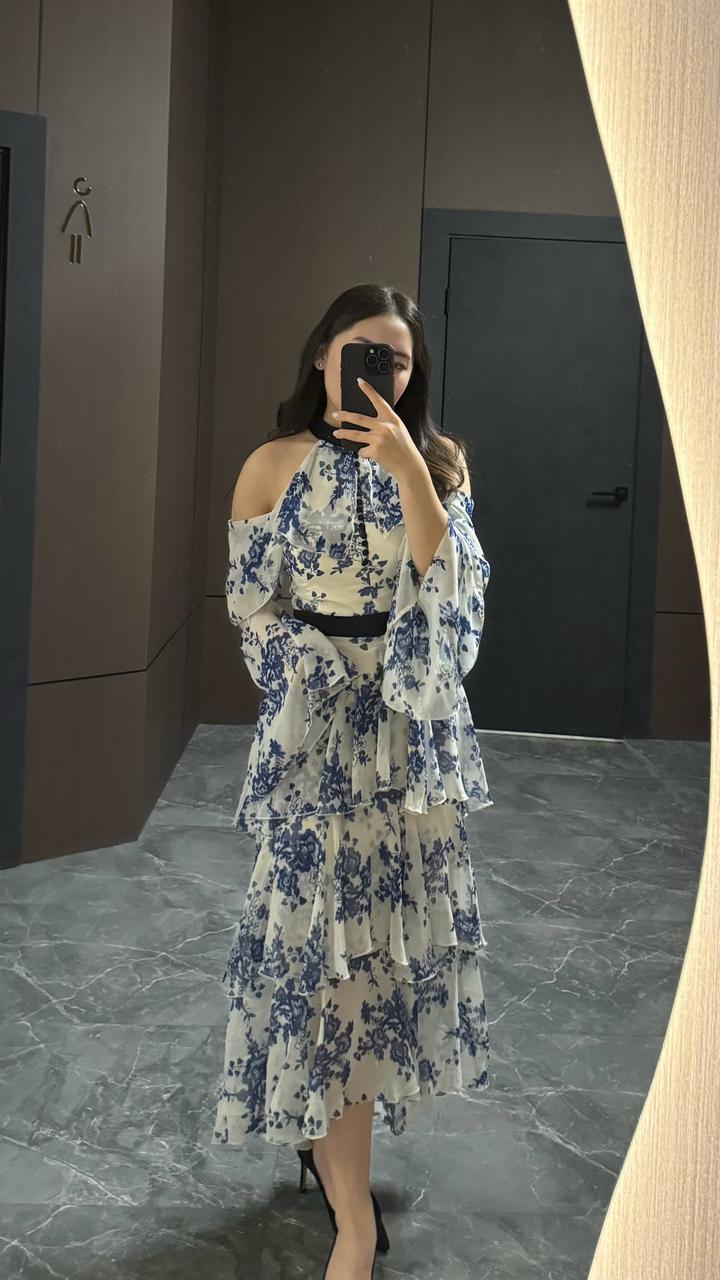 Лёгкое белое платье с синим цветочным принтом, открытые плечи, расклешённые рукава и многослойная юбка с воланами. Артикул: 561800