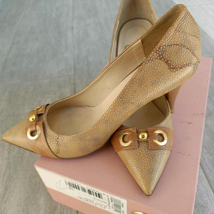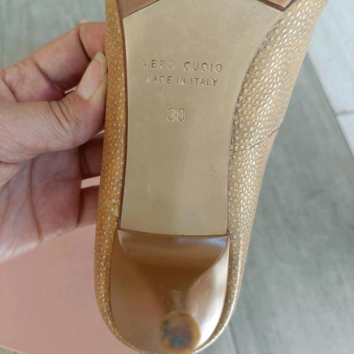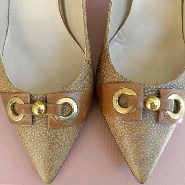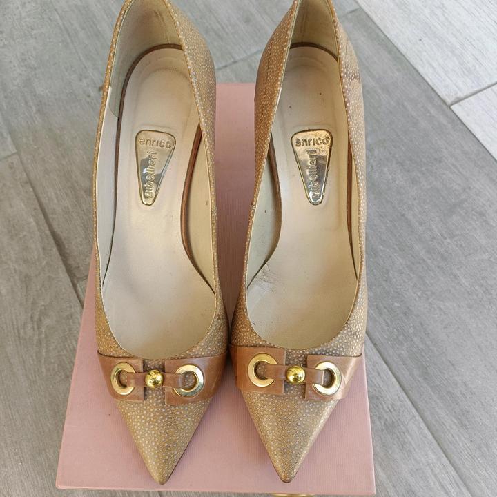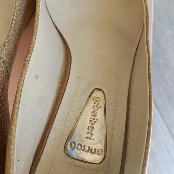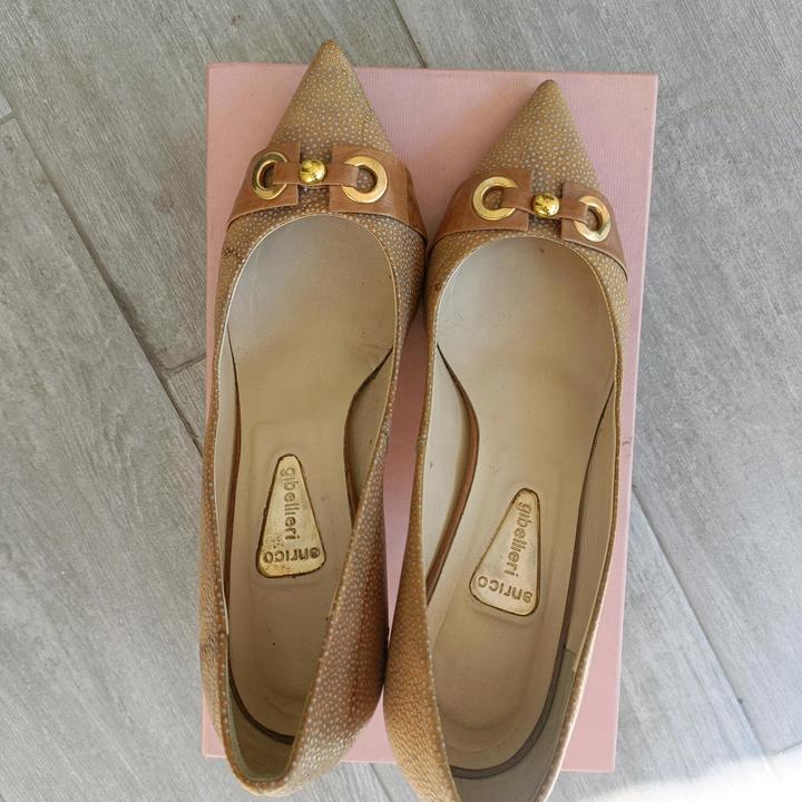 Светло коричные,кожаные туфли,в очень хорошем состоянии. Удобный не высокий каблук. Стильные,классика. Носила очень редко. Enrico Gibellieri. Это элегантные лодочки с заостренным мысом, выполненные из фактурной кожи бежевого цвета (имитация кожи ската или тиснение). Основной декоративный элемент — двойная металлическая пряжка в форме буквы «C» на кожаной перемычке. ℹ️ Основные сведения Бренд: Enrico Gibellieri Производство: Италия 🇮🇹 (Made in Italy) Стиль: Классические лодочки / балетки Артикул: 561977