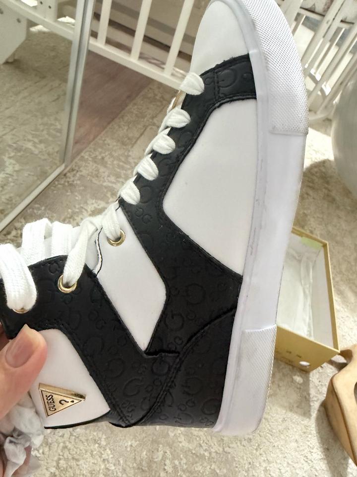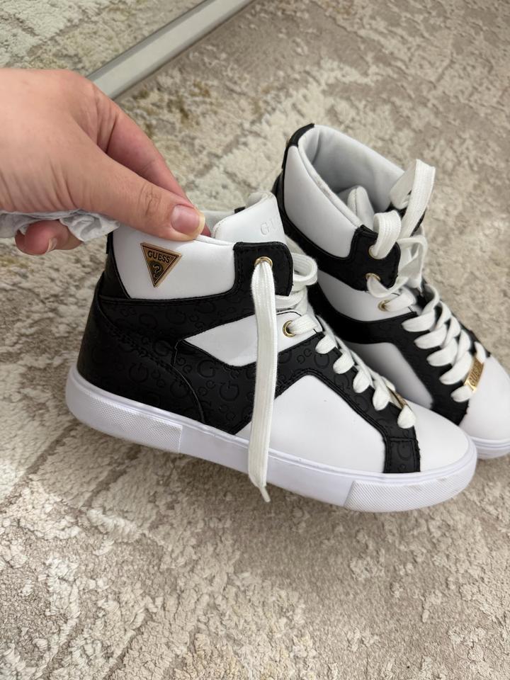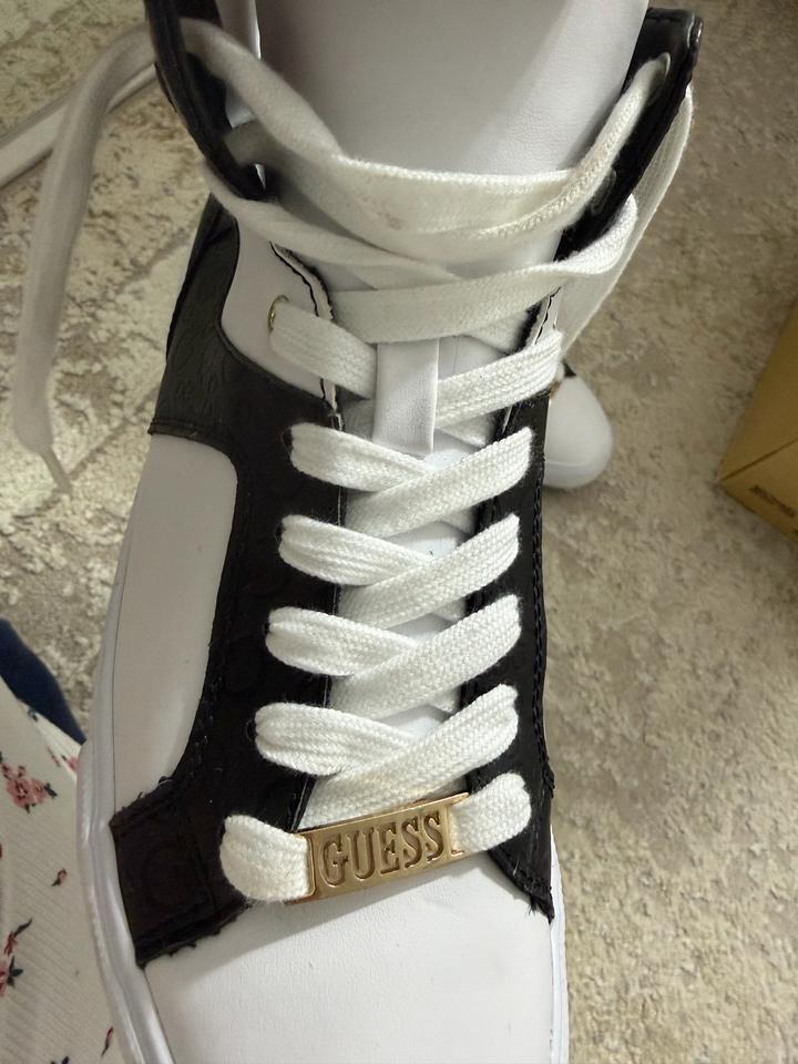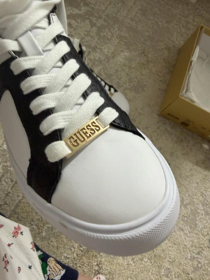 Кроссовки GUESS (Оригинал) – Стильная черно-белая классика Продаю оригинальные кроссовки от легендарного бренда GUESS. Эта пара станет идеальным акцентом в любом образе, добавляя ему нотку шика и статусности. • Дизайн: Эффектное сочетание кипельно-белой кожи и контрастных черных вставок с легким принтом (логотипы Guess). • Акцент: Фирменная золотистая пластина с гравировкой "GUESS" на шнуровке — визитная карточка бренда. • Материал: Натуральная / высококачественная эко-кожа (мягкая, комфортная в Артикул: 562614