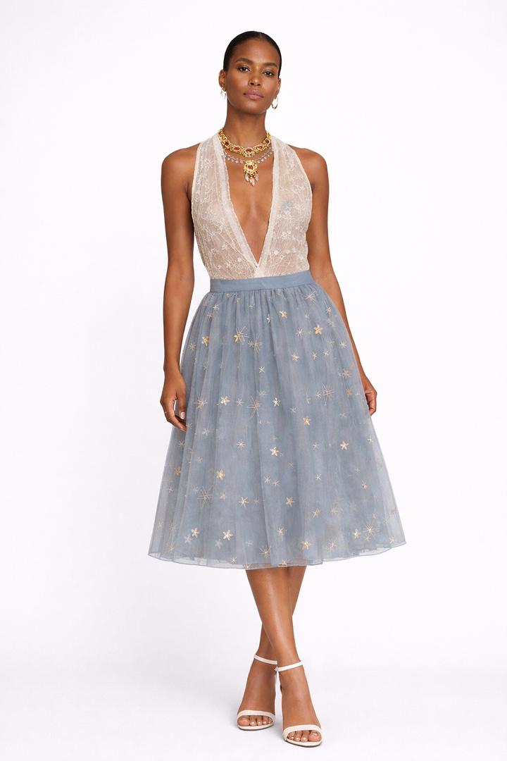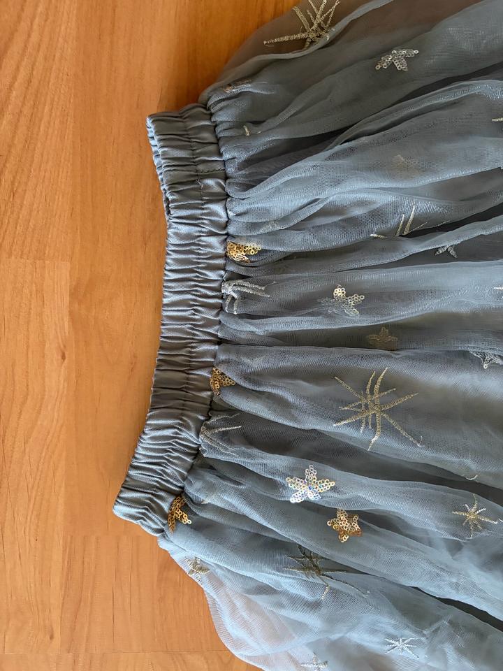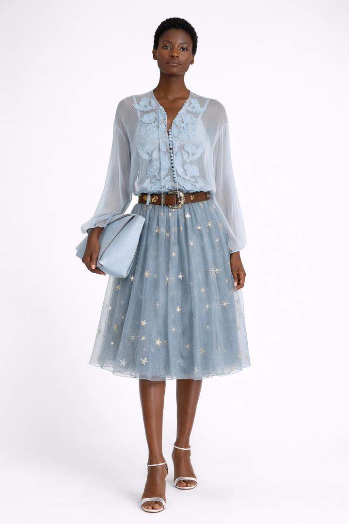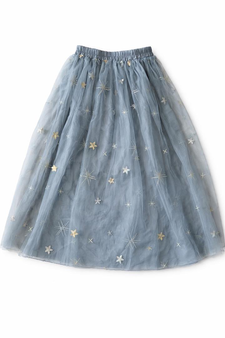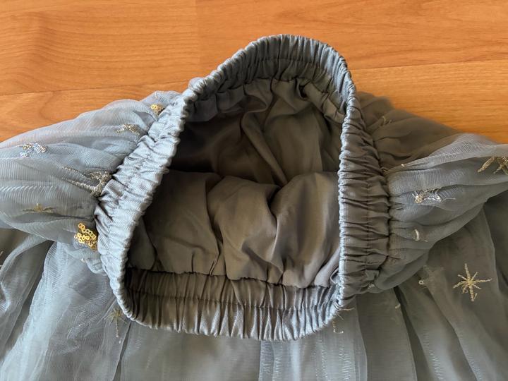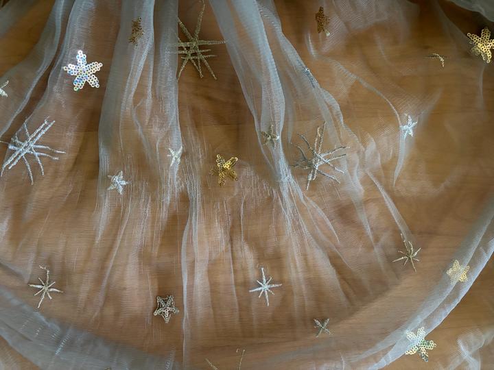 Пышная юбка миди из полупрозрачного фатина в серо голубом оттенке. Декорирована вышивкой в виде звезд Эластичный пояс обеспечивает комфортную посадку, а многослойная ткань красиво держит форму и объём. Есть один ньюанс, указан на последнем фото, в носке не заметке так как в юбке два слоя фатина. Артикул: 562914