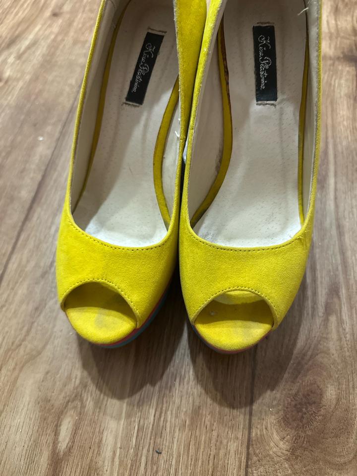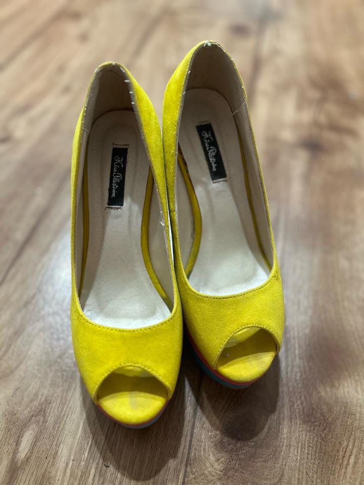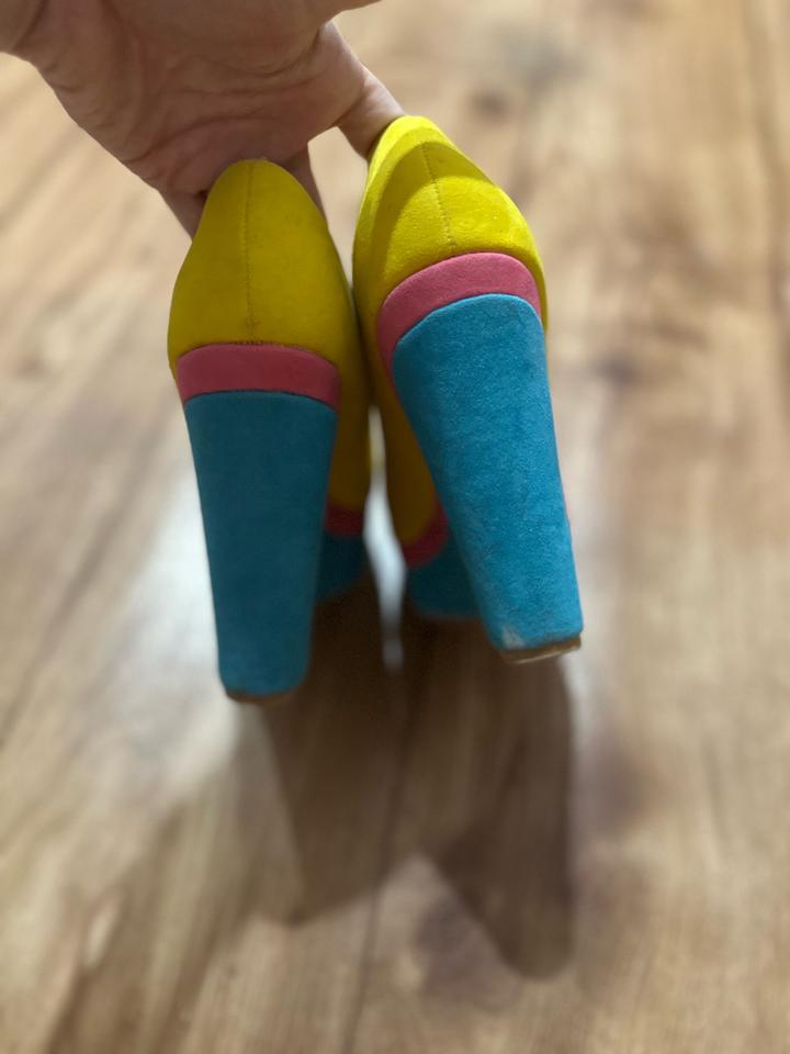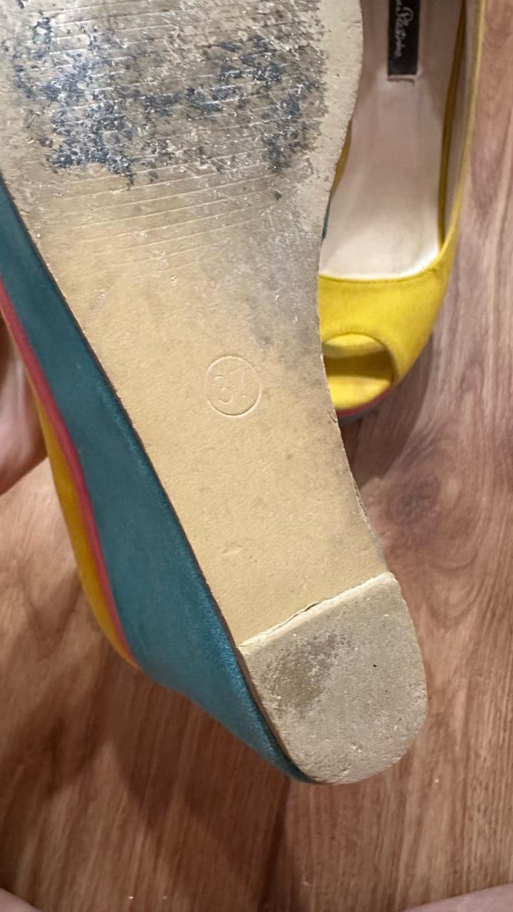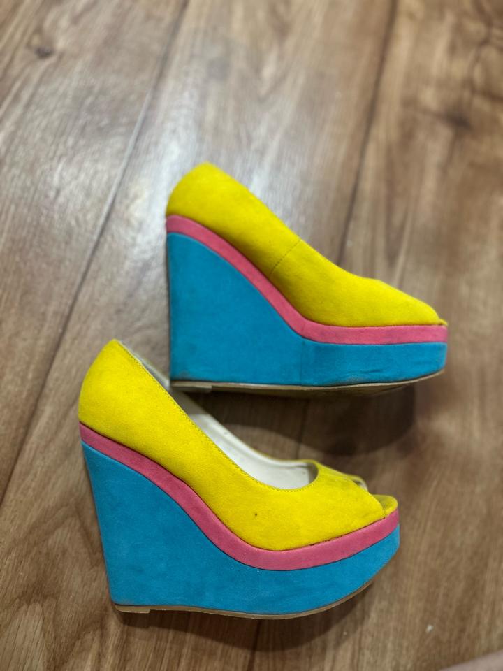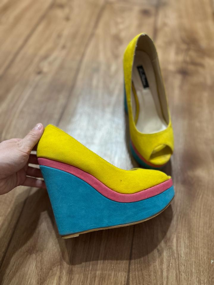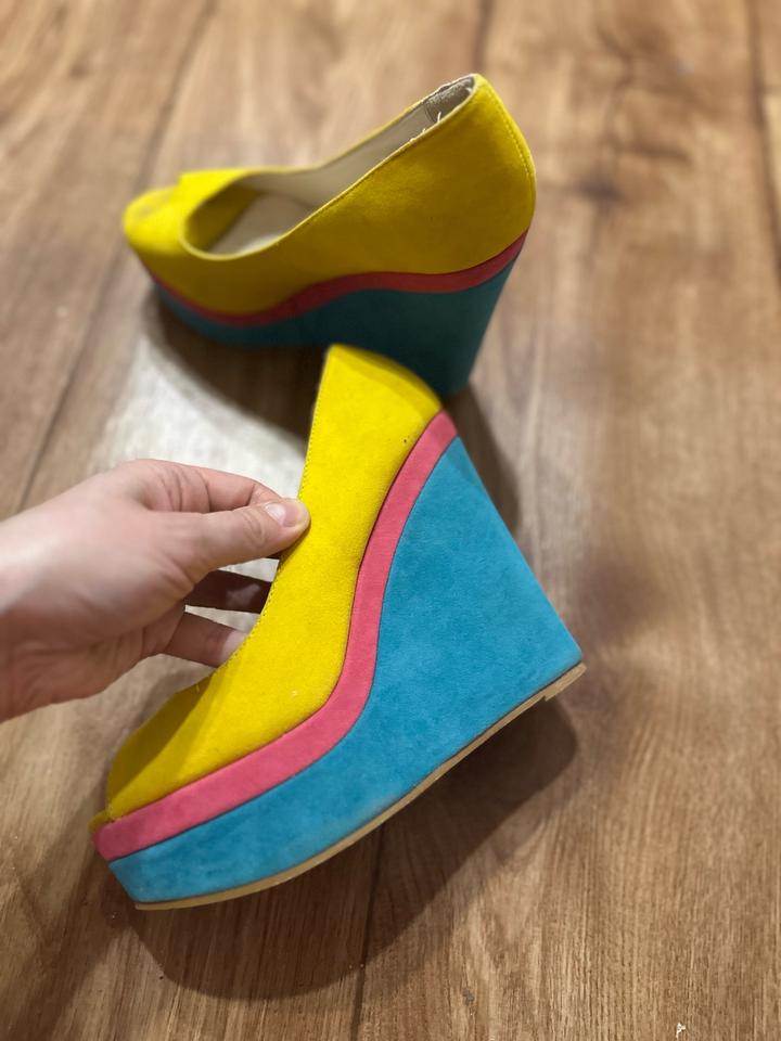 Яркие туфли в эстетике Y2K — тот самый дерзкий поп-стиль нулевых. Сочный лимонный верх, контрастная танкетка в бирюзово-розовой гамме и открытый нос — чистый глам и настроение «Barbie era». Идеально для акцентных образов: мини, деним, топы, стразы и максимум цвета. Состояние: требуется легкая чистка. Для тех, кто не боится быть заметной ✨ Артикул: 562959