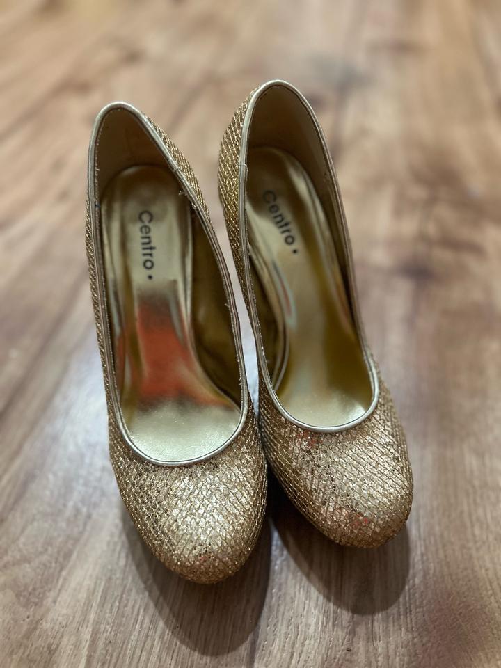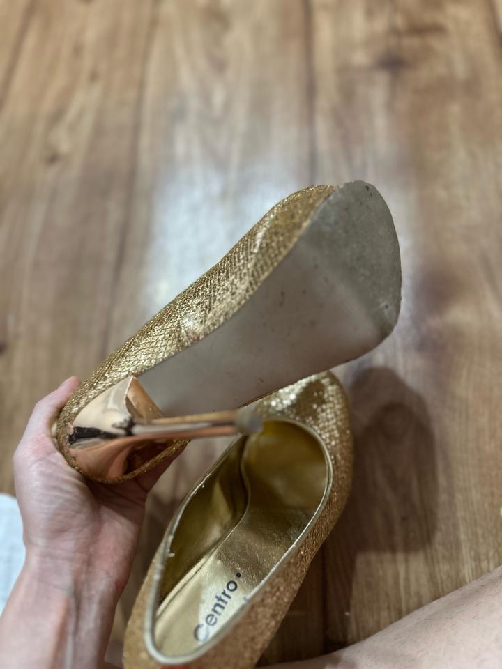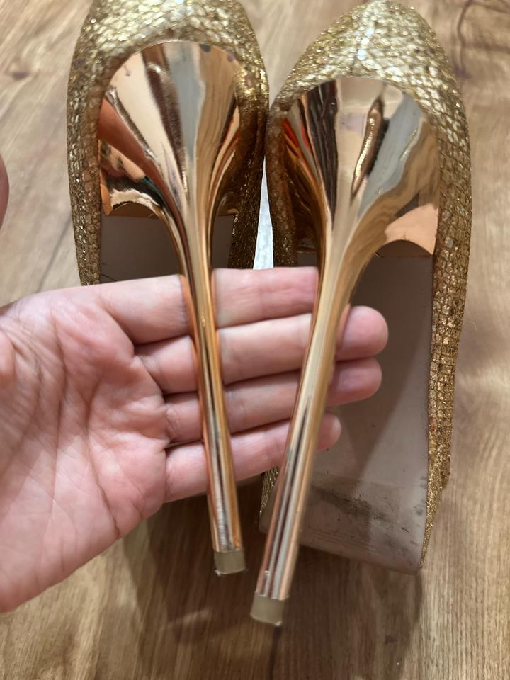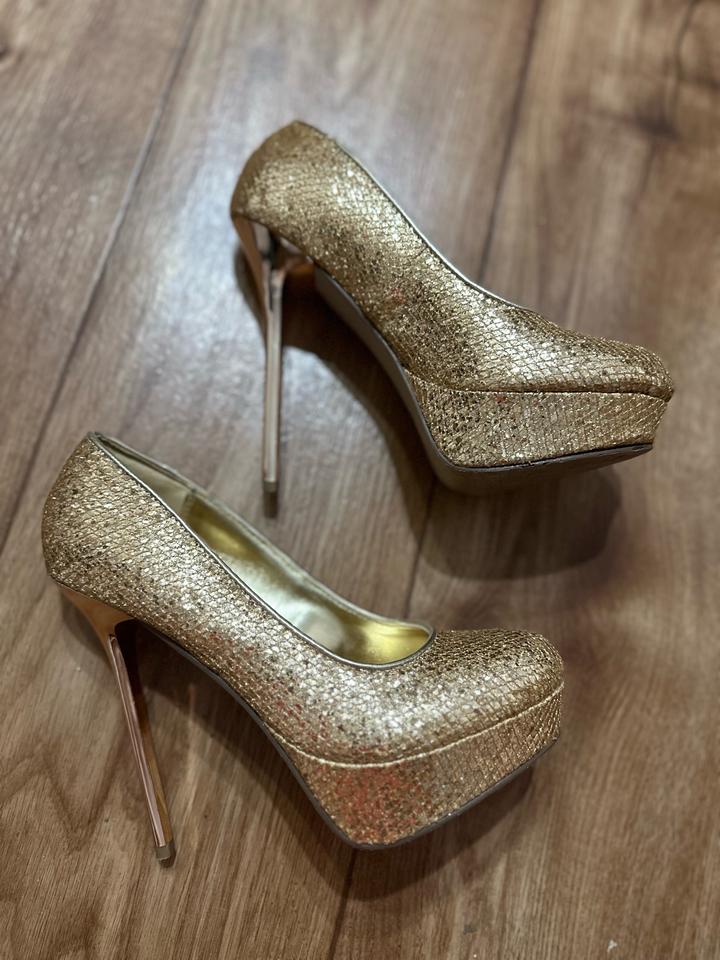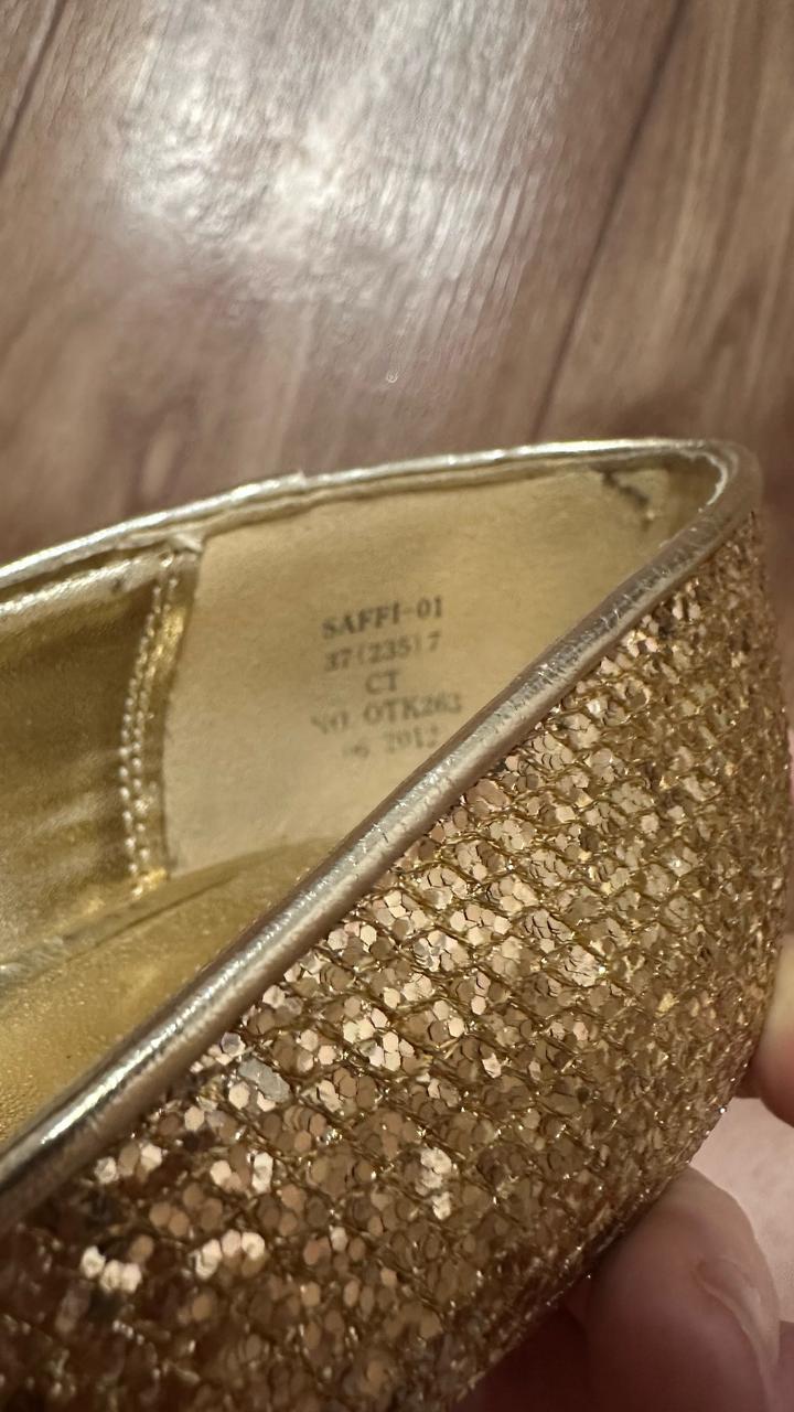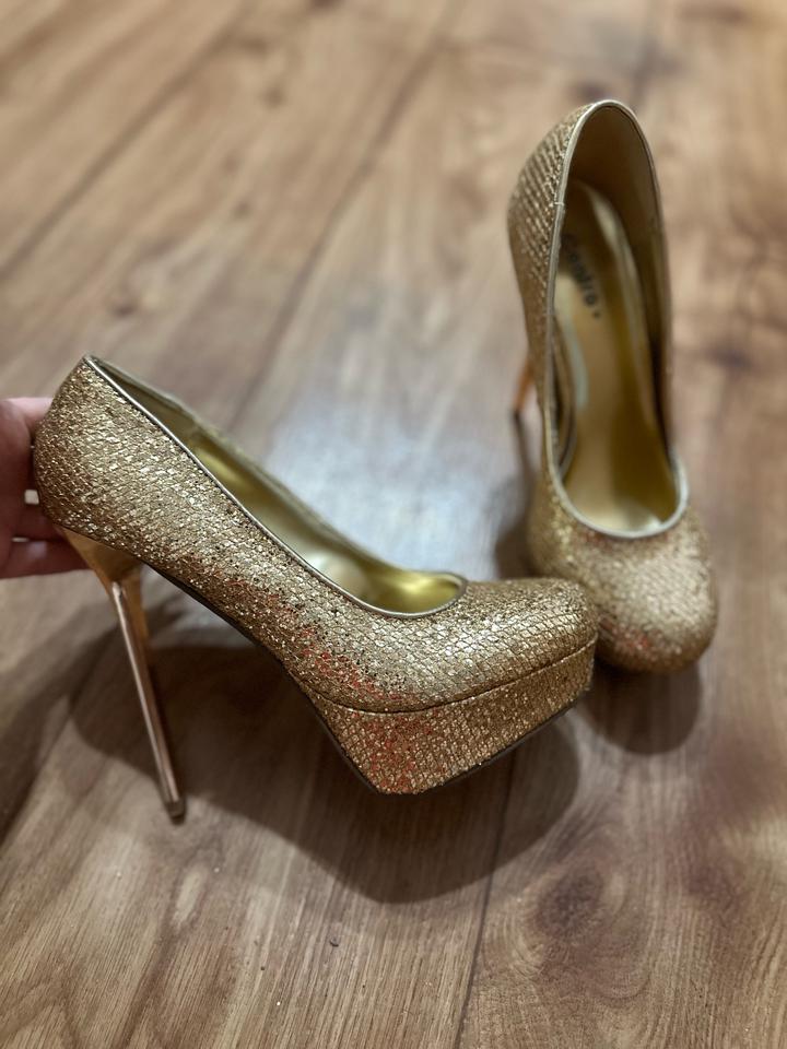 Эффектные туфли в стиле нулевых: золотое сияющее покрытие, высокая шпилька и платформа. Максимум гламура и настроения вечеринок 2000-х. Идеальны для образов в стиле Y2K, glam, party. Артикул: 562993