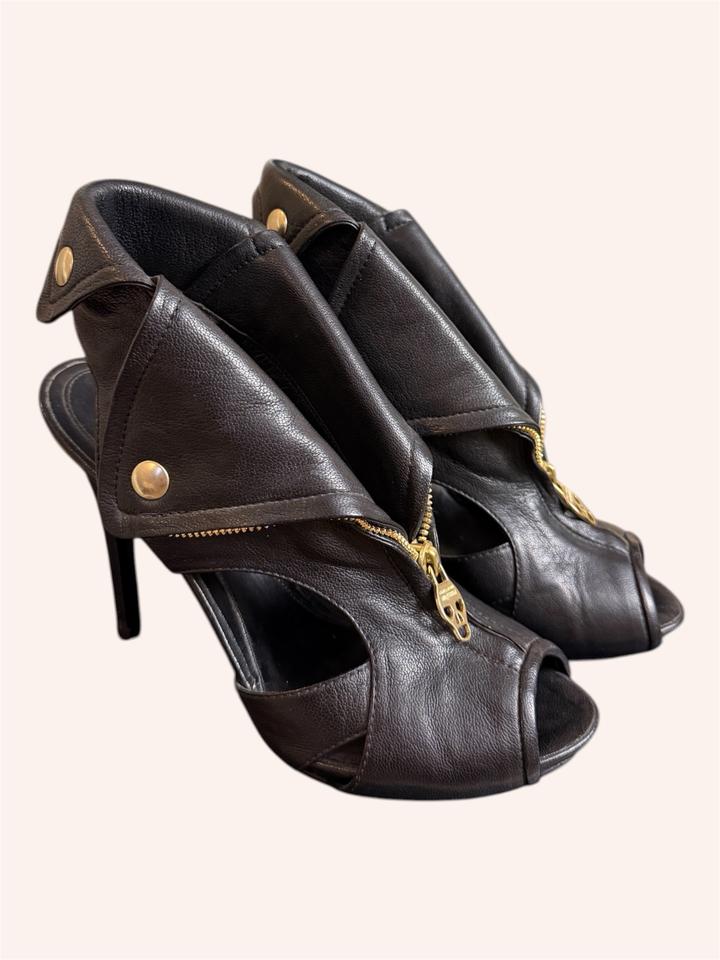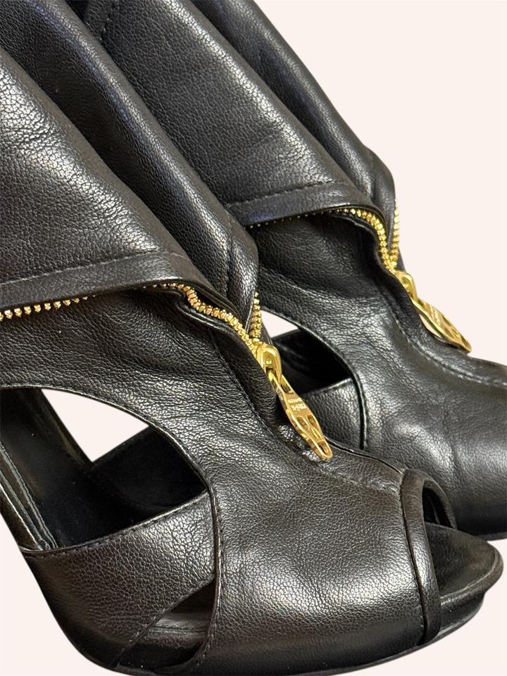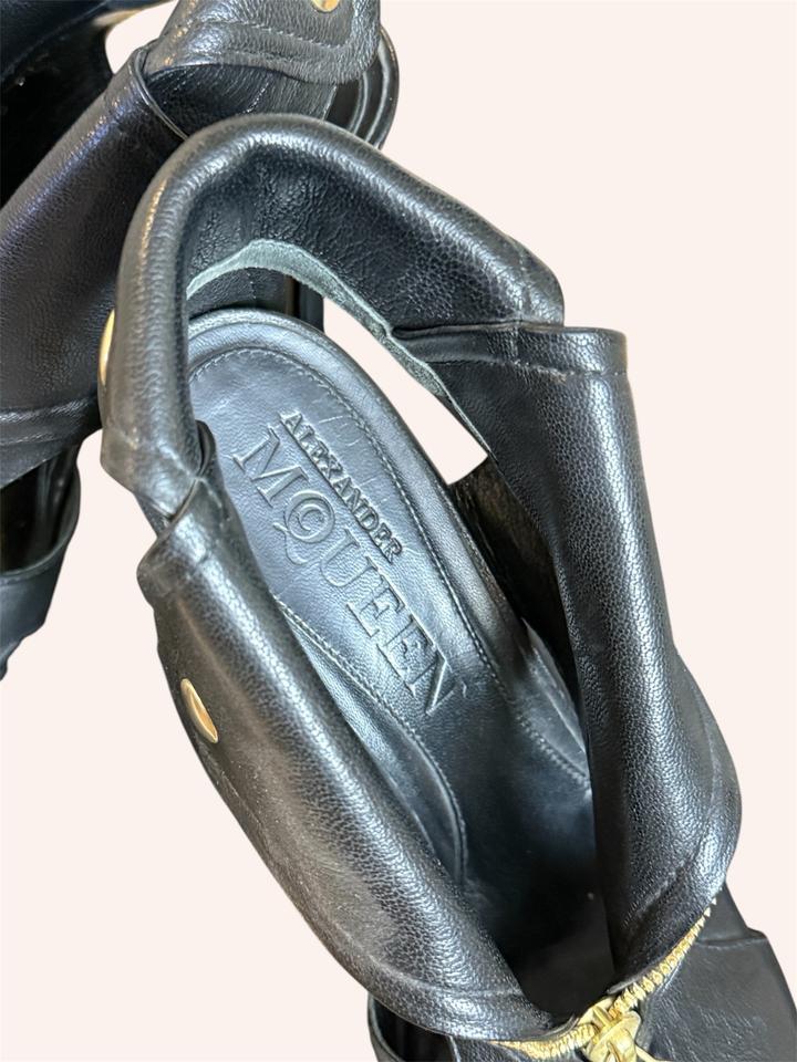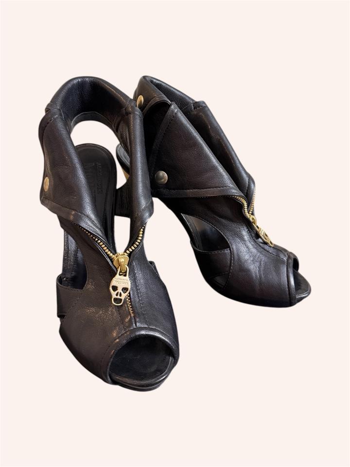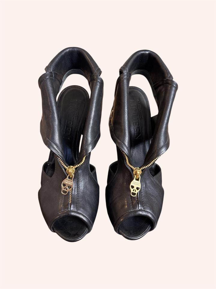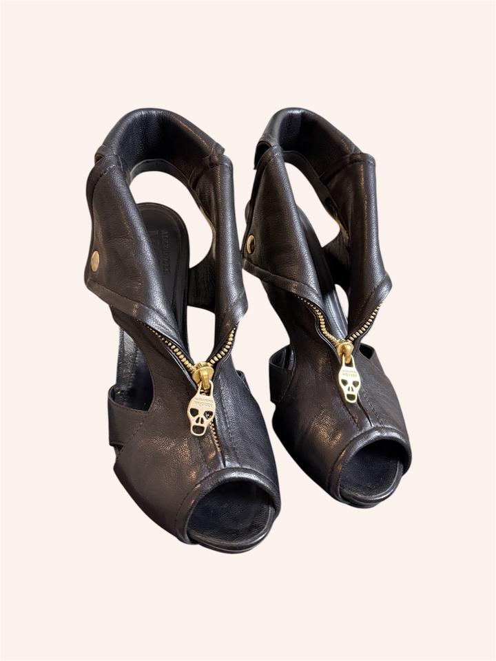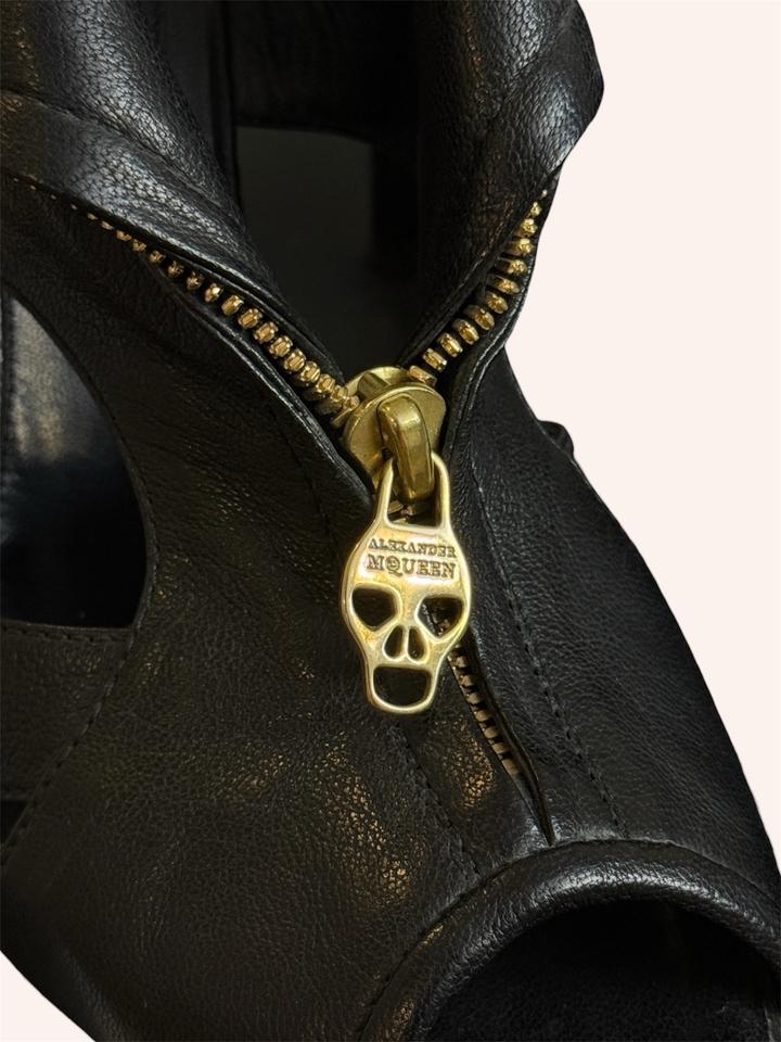 Alexander McQueen Faithful Skull Zip Peep-Toe Ankle Boots. Оригинальные ботильоны с культовым дизайном. Натуральная кожа (до сих пор в отличном состоянии), золотая фурнитура. Фирменная молния с черепом, скрытая платформа, открытый нос (peep-toe) Архивная модель Alexander McQueen с черепами - один из самых узнаваемых и характерных силуэтов эпохи McQueen. Идеальное состояние, стоит профилактика. Коробки уже нет. Артикул: 563191