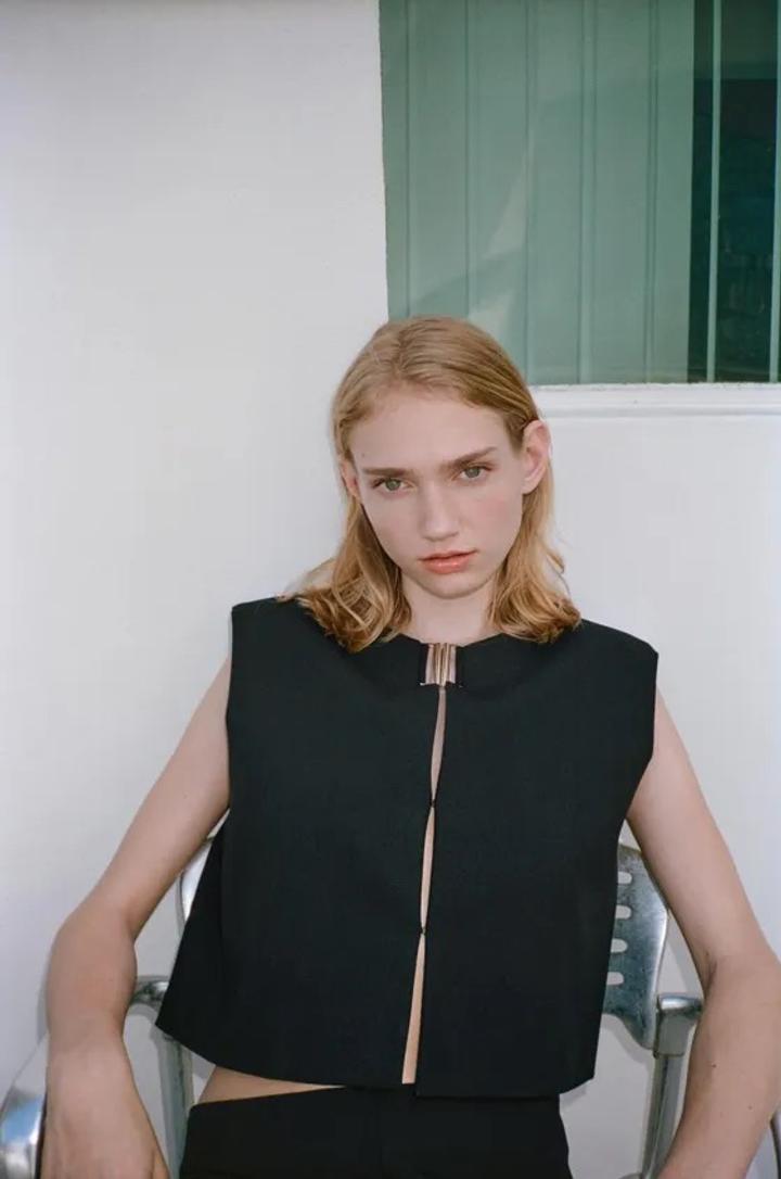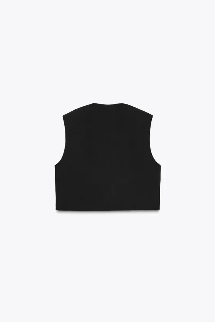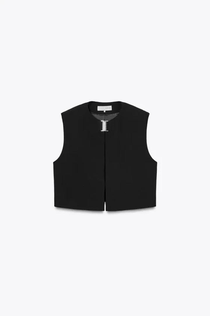 Жилет с круглым вырезом и подплечниками. Застегивается на потайные крючки и декоративную металлическая застежку Артикул: 563463