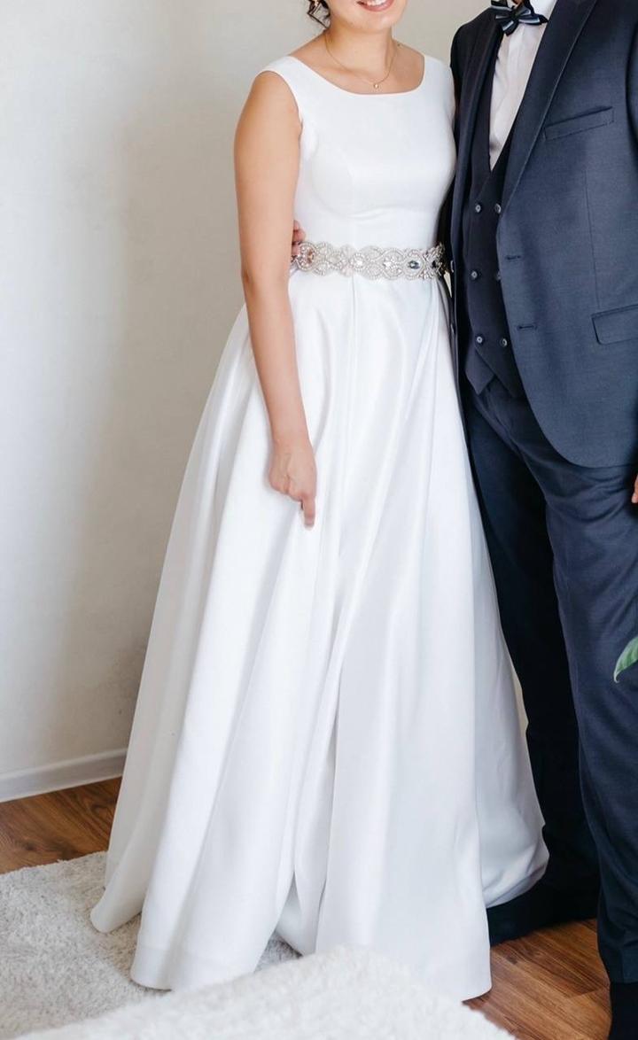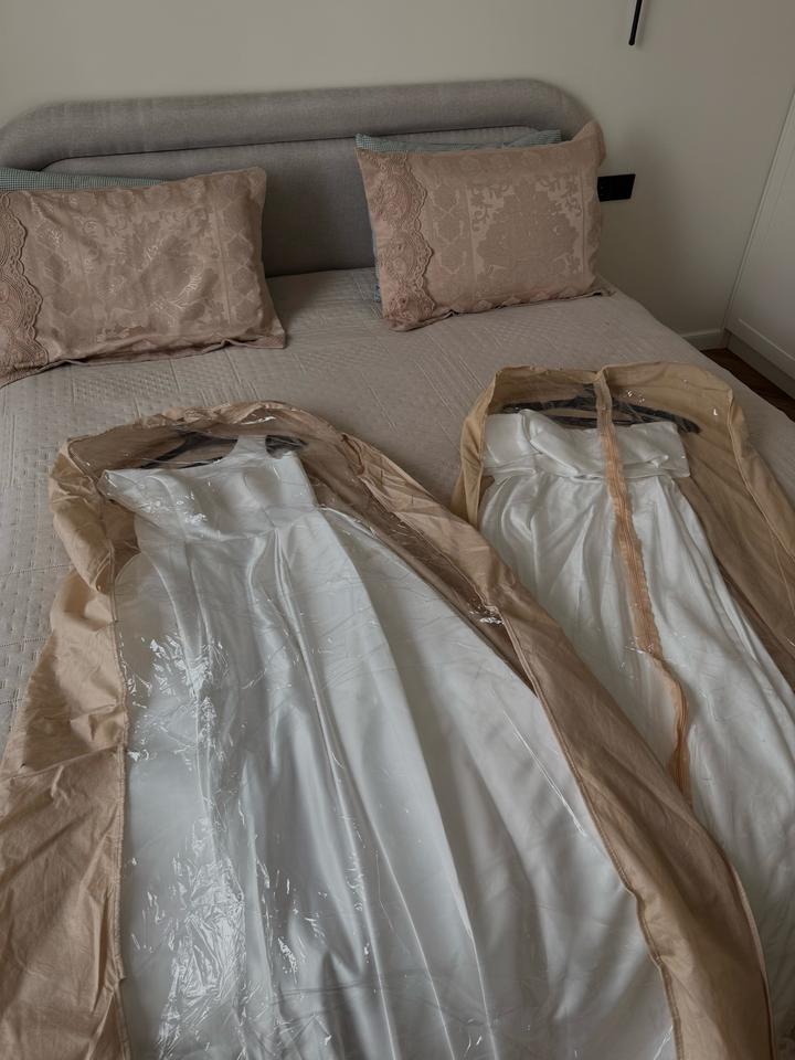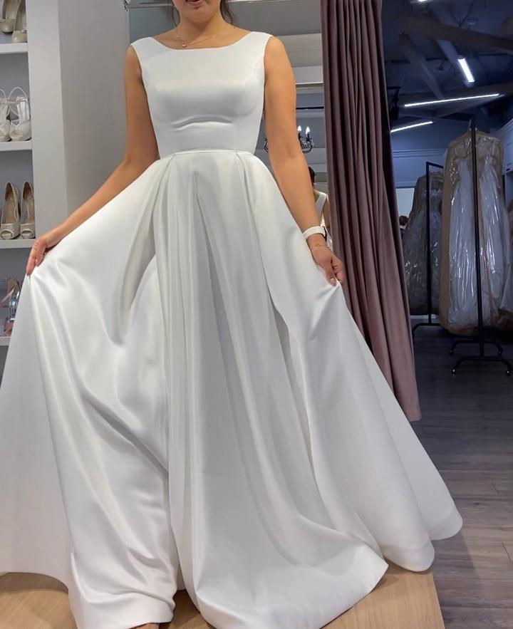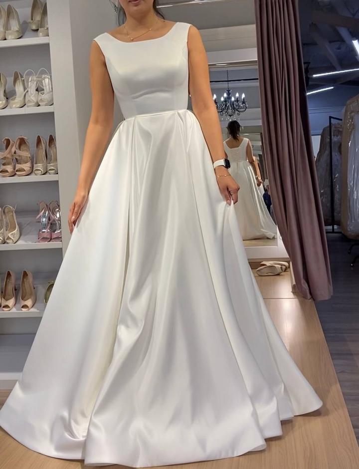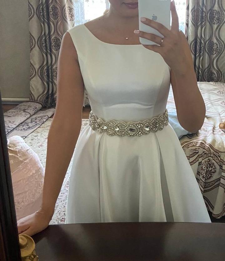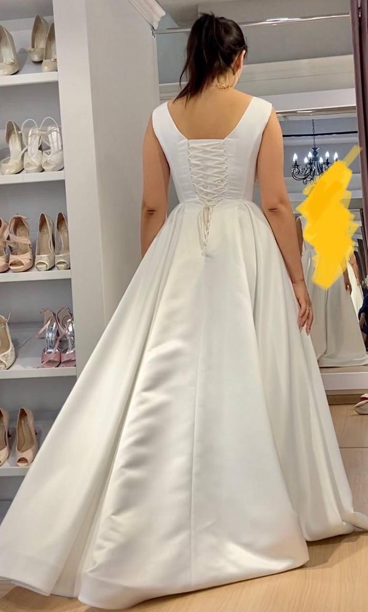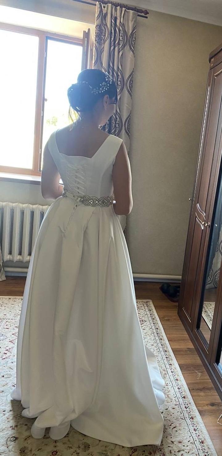 Свадебное платье после хим чистки, надевалось 1 раз, плотный атлас Размер 44-46 Артикул: 564258