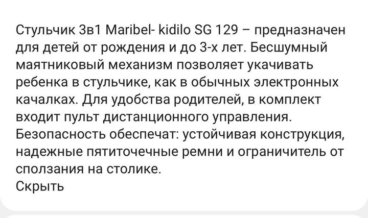 Стульчик для кормления 3в1, качеля и шезлонг. Состояние отличное. Музыкальное проигрывание для качели и автоматически качается. Подходит от 0 до 4лет Артикул: 564340