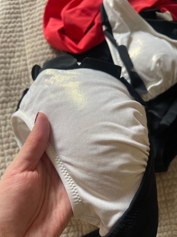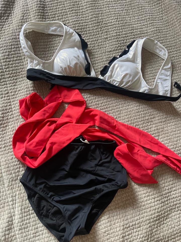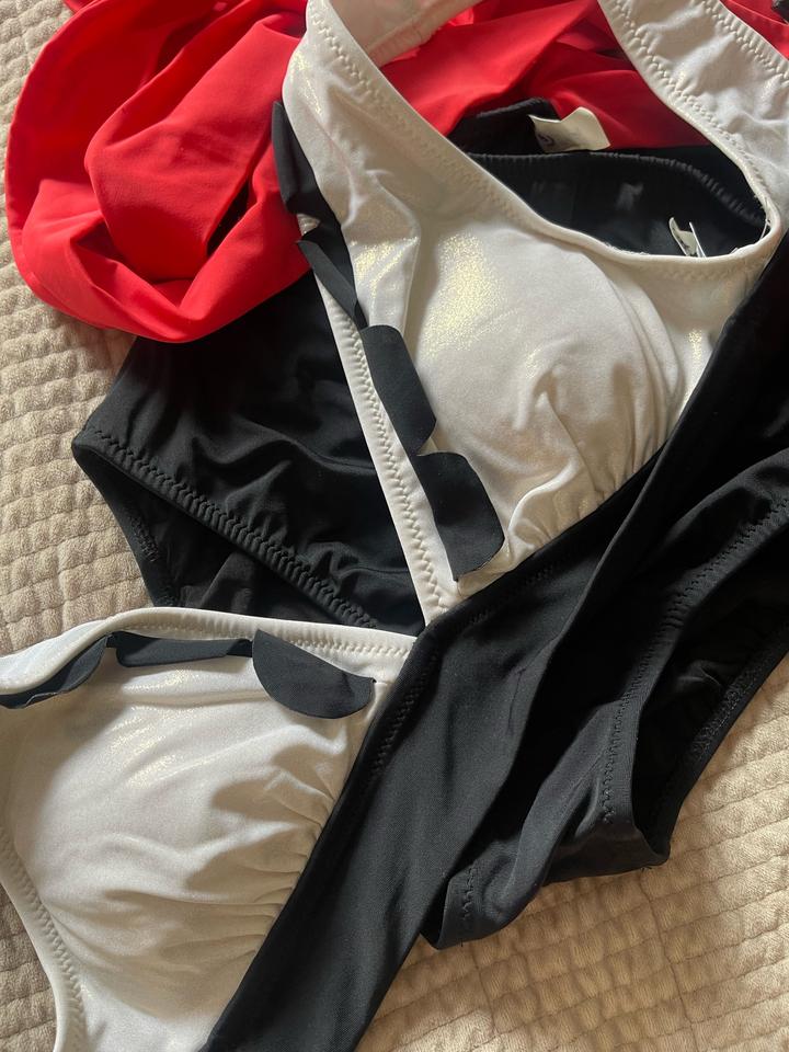 Купальник, без бирок, не носила. У него необычный фасон, трусики завышенная посадка и на них пояс красный. Получается как бантик. Покупала за границей. На размер S/M Артикул: 564585