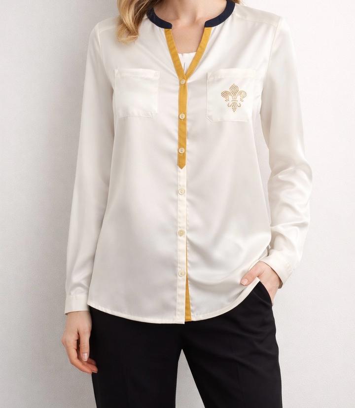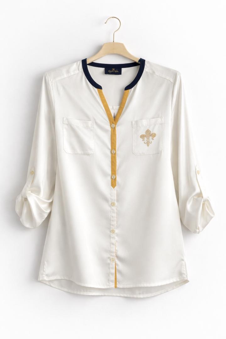 Элегантная блузка немецкого бренда Eugen Klein Лёгкая, струящаяся ткань с шелковистым эффектом — приятна к телу и красиво садится по фигуре. - универсальный молочный цвет - стильная отделка в золотом и тёмном оттенке - можно носить как с брюками, так и с юбкой - рукав регулируется (3/4) Идеально для офиса, встреч и повседневного элегантного образа. Состояние: хорошее, есть лёгкие следы носки (не критично) Артикул: 564814