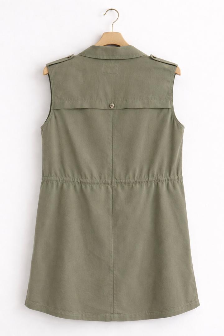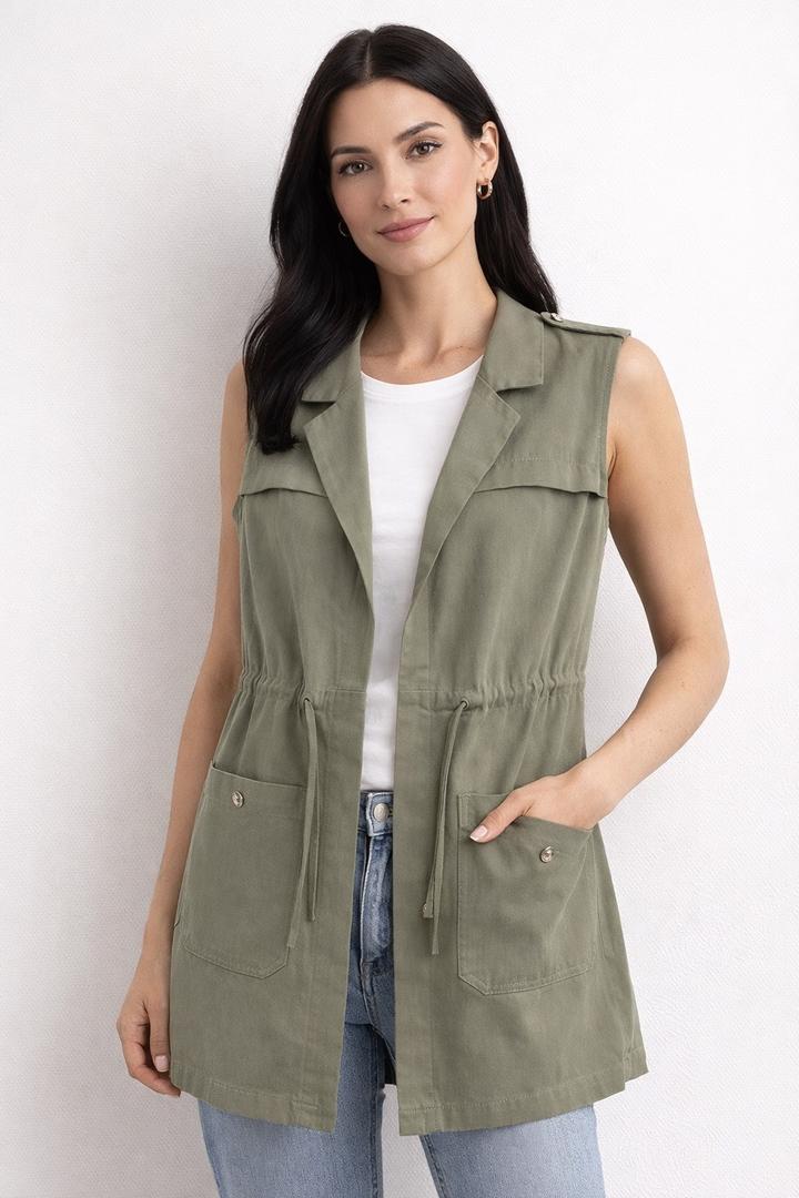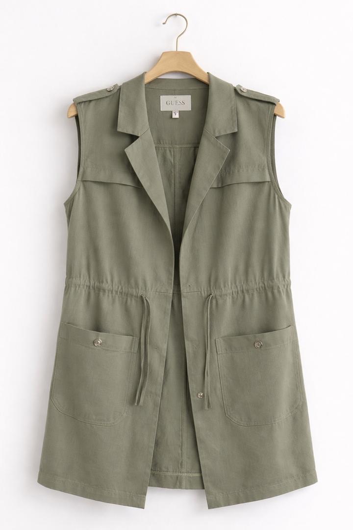 Стильный жилет от бренда GUESS Трендовый оттенок хаки — легко сочетать с любыми вещами. • стиль сафари / милитари • утягивается в талии (стройнит) • крупные карманы (практично + стильно) • оригинал • плотная качественная ткань • можно носить как верхний слой (весна/осень) Идеально смотрится с: — джинсами — брюками — платьями Артикул: 564842