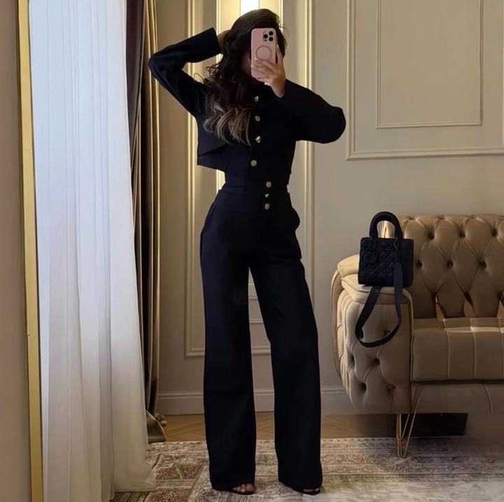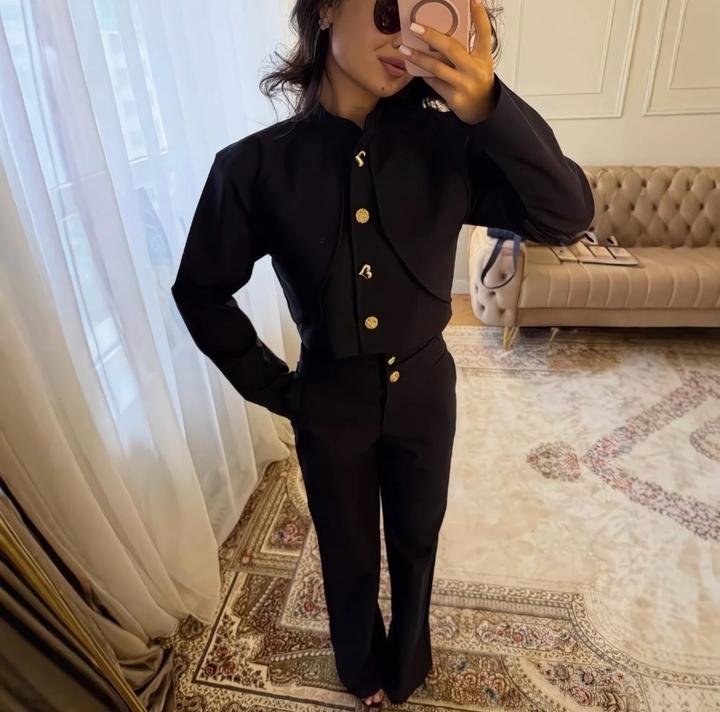 Элегантный комплект, который подчёркивает фигуру и создаёт стройный, аккуратный силуэт. Жакет с оригинальным кроем и золотыми пуговицами придаёт образу дорогой и утончённый вид. Брюки отлично садятся по фигуре, визуально удлиняют ноги. Идеально подойдёт для работы, деловых встреч и особых мероприятий. Стильно, строго и женственно одновременно 🤍 Артикул: 564887