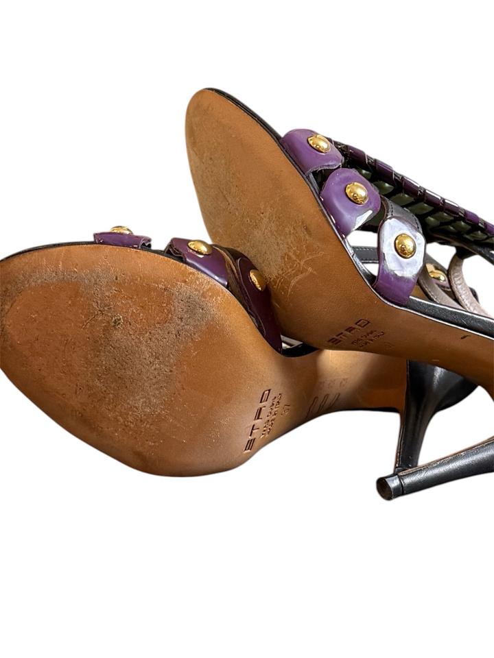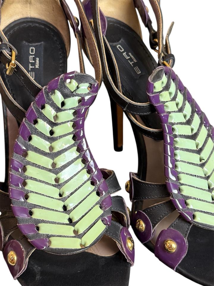 Эффектная дизайнерская модель с «cage» плетением и фирменным узором бренда пейсли (индийский огурец). Натуральная кожа. Удобная фиксация на щиколотке. Устойчивый каблук. В идеальном состоянии. Без коробки. Артикул: 565047