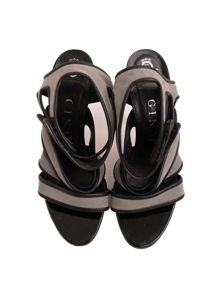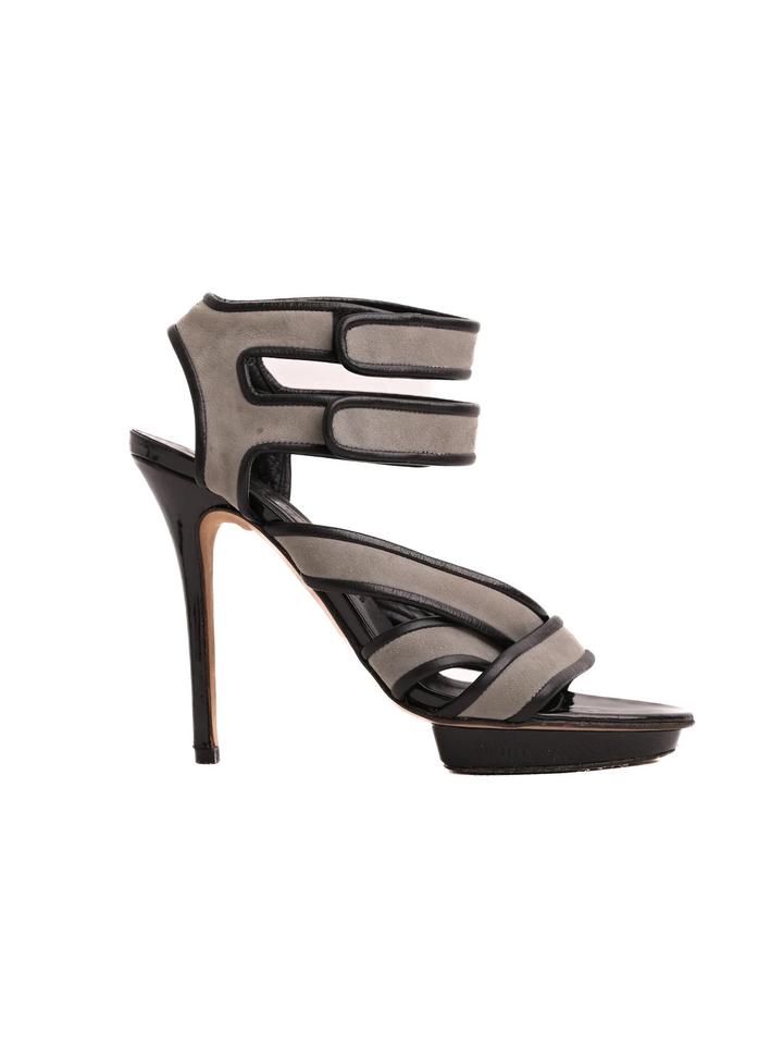 Обувь выполнена из серой замши с контрастной черной кожаной отделкой. Отличительной чертой являются широкие ремешки на липучках, обхватывающие лодыжку. Артикул: 565443
