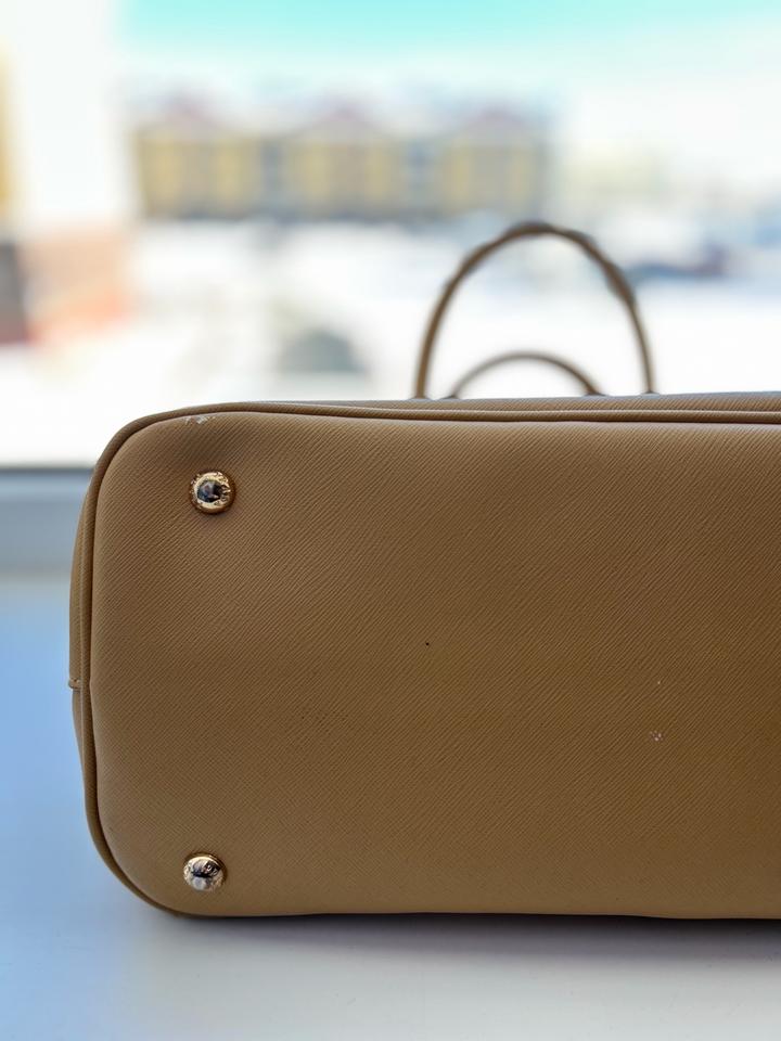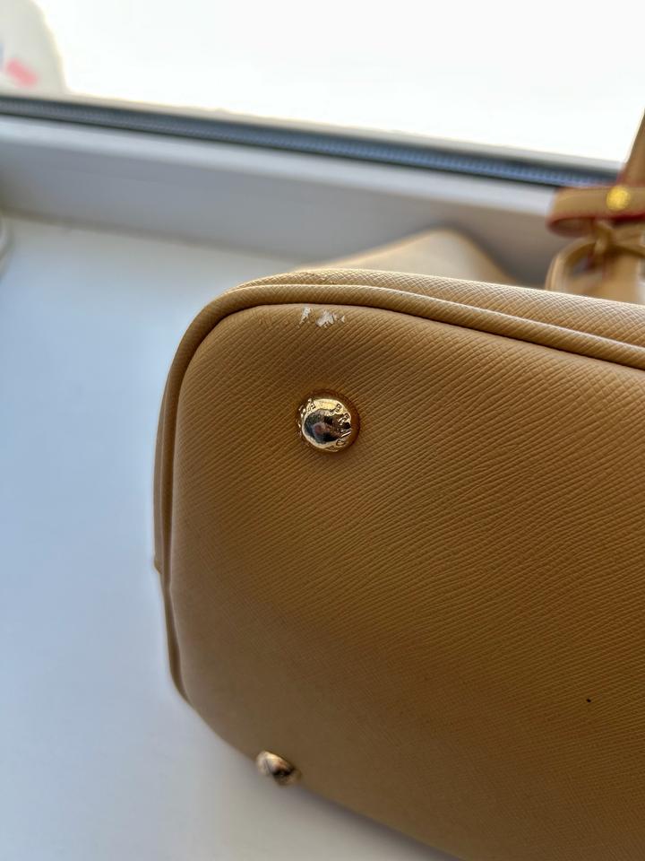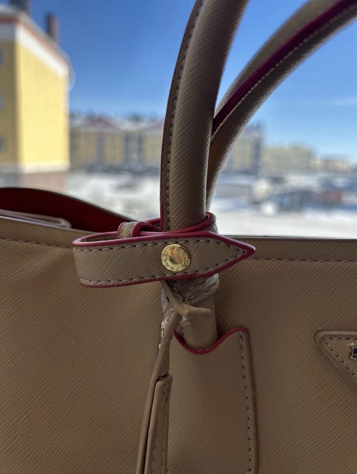 Продам сумку Prada Double Bag из фирменной кожи Saffiano Cuir. Очень красивое и статусное сочетание цветов: карамельный снаружи и огненно-красный внутри. Состояние:Есть естественные потертости на уголках (видно на фото), в остальном кожа и фурнитура в отличном порядке. Особенности: Кожа Saffiano отлично держит форму, внутри удобное отделение на магните. Нюанс: Длинный плечевой ремень утерян, продаю как ручную сумку (tote), что уже учтено в цене. Можно договариваться по цене Артикул: 565521