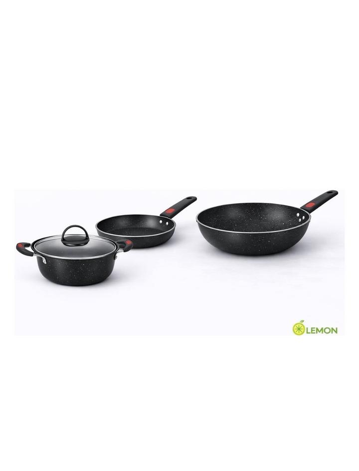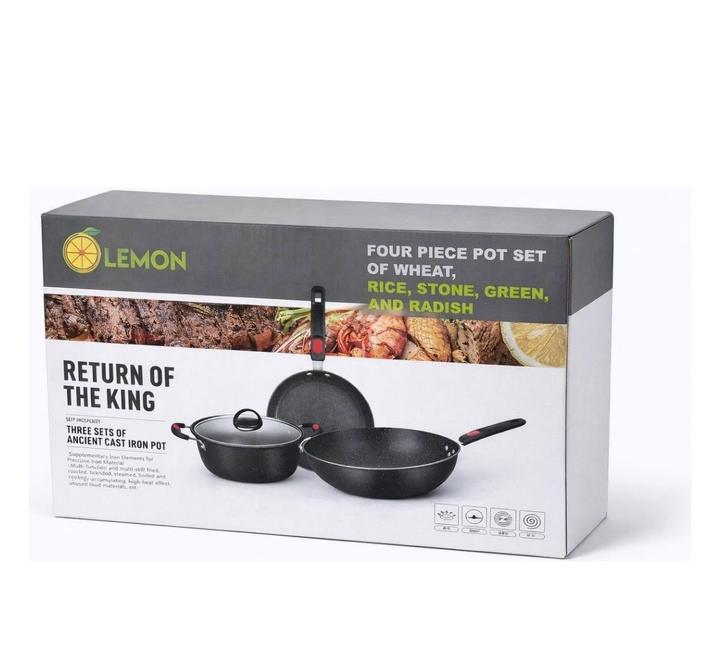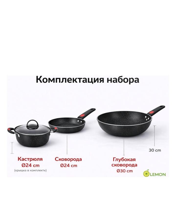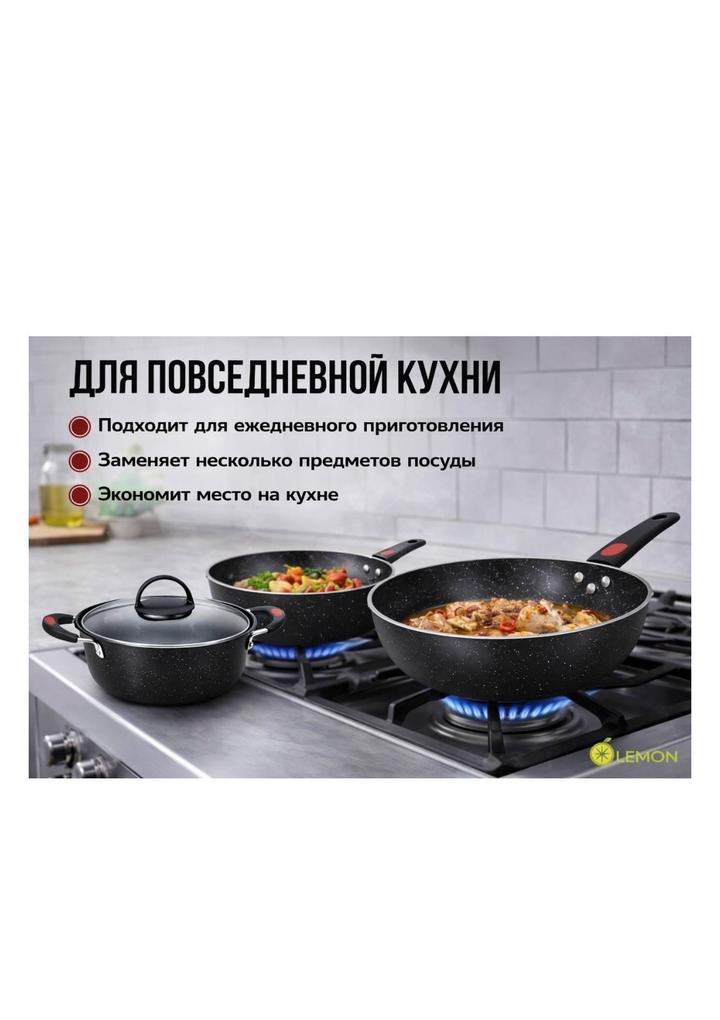 Новый набор в коробке, состоит из кастрюли 24см, сковорода 24см, и глубокая сковорода 30см, подходит для всех видов плит. Набор кастрюль из нержавеющей стали, материал корпуса алюминий с антипригарным покрытием, покрытие мраморное Артикул: 565575