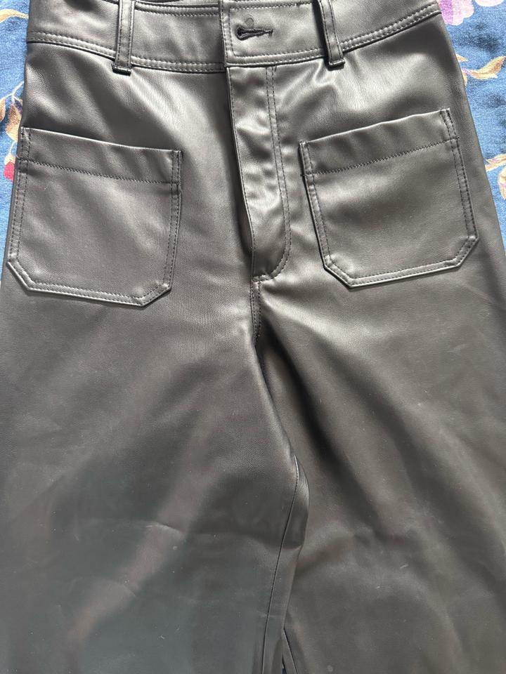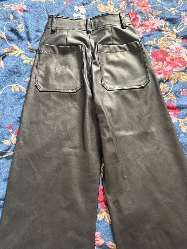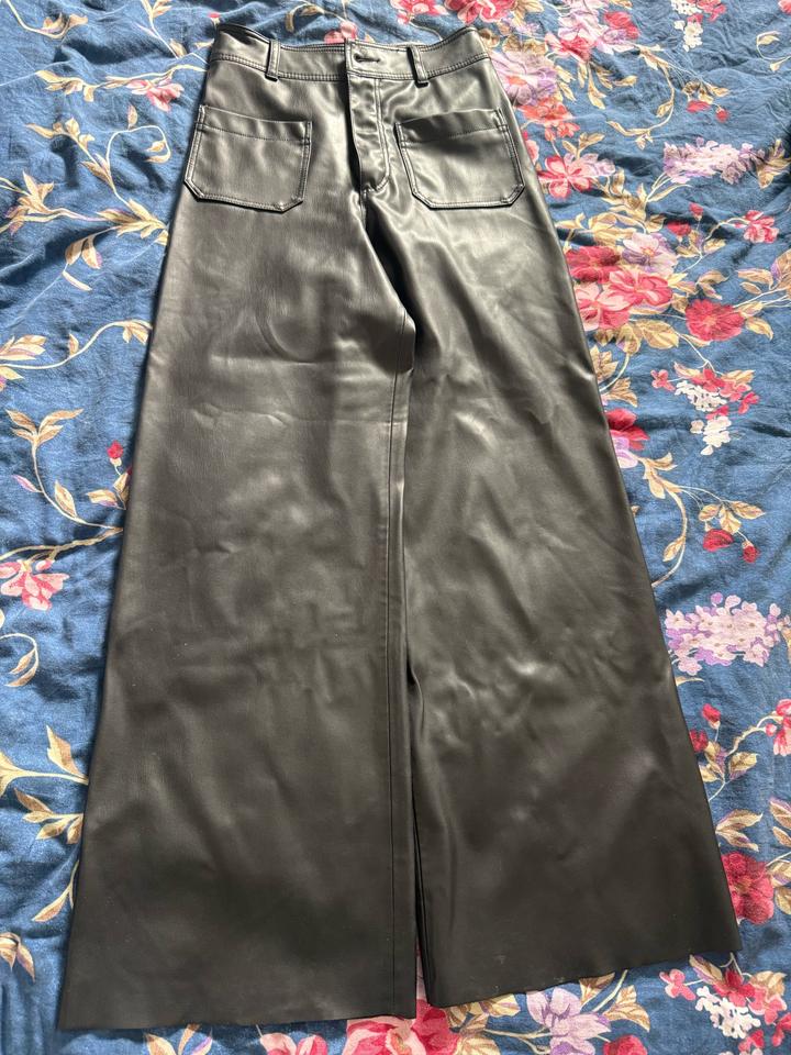 Кожаные штаны Zara. Очень классные, удлиняют ноги, низ разклешен. Надевались всего пару раз, прежняя цена 21000тг. Размер S Артикул: 565630