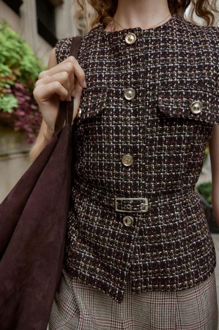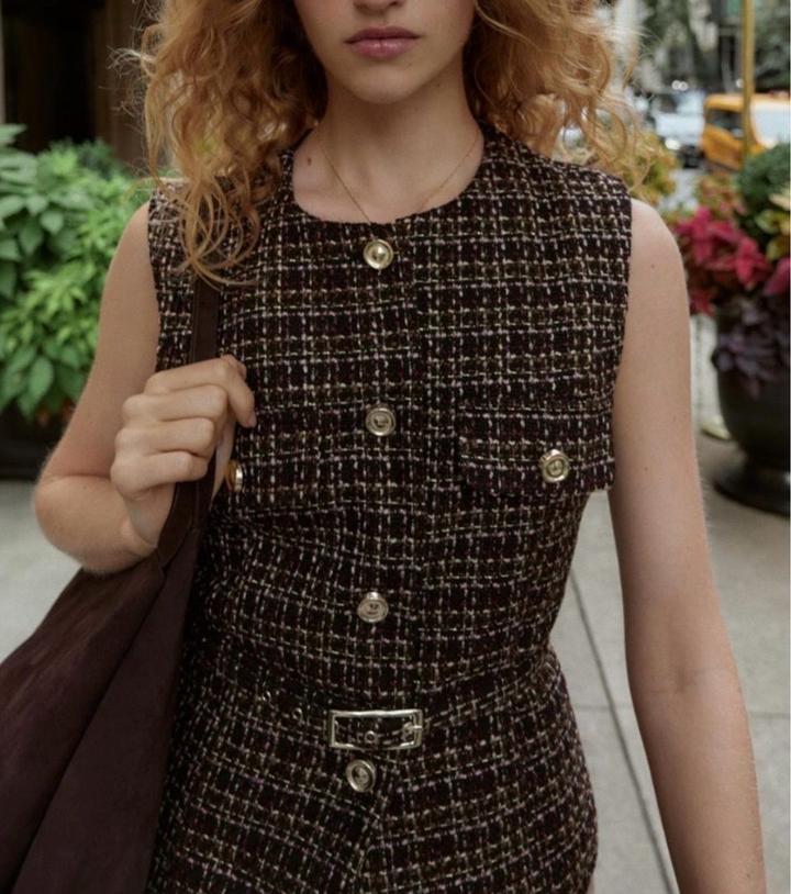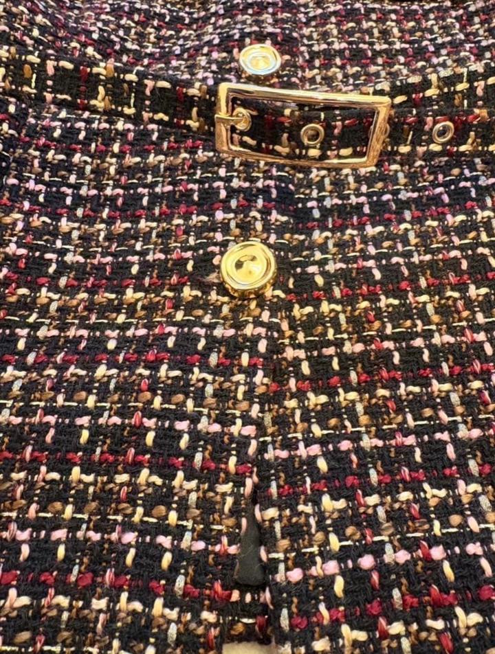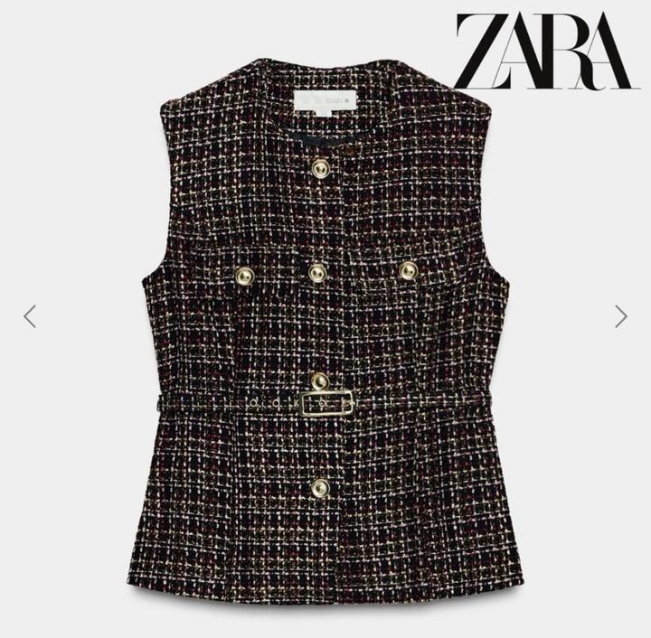 Новый твидовый жилет с ремнем от Zara Размер М Цвет разноцветный С золотистыми пуговицами и акцентным ремнем на талии Брала за 31.990 Артикул: 566303