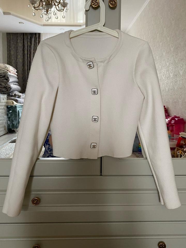 Кофта теплая(немного укороченного фасона). Клепки под шанель выглядят минималистично и красиво. Есть дефекты, отлетели пару клепок(фото прилагается) Артикул: 566579