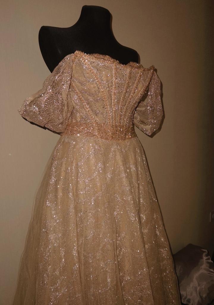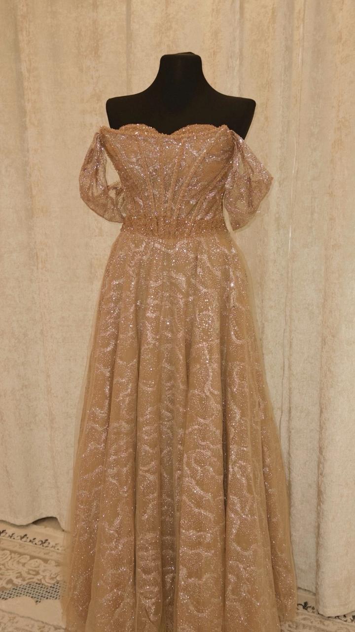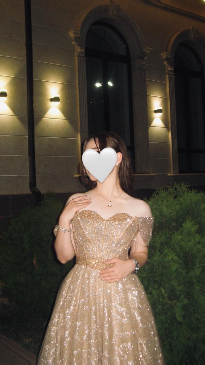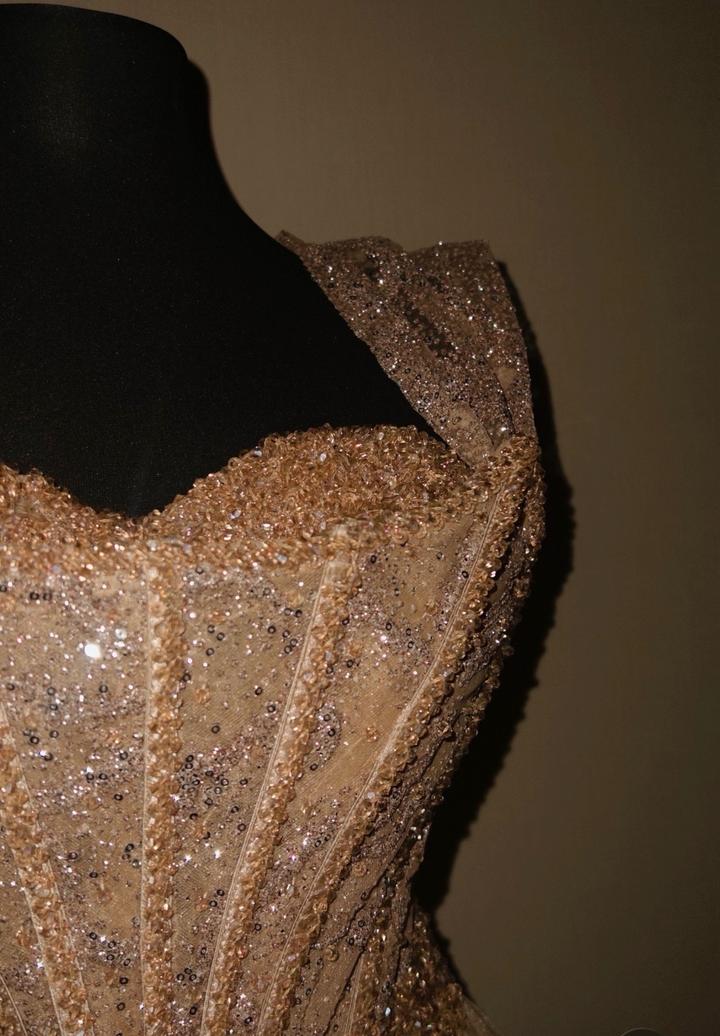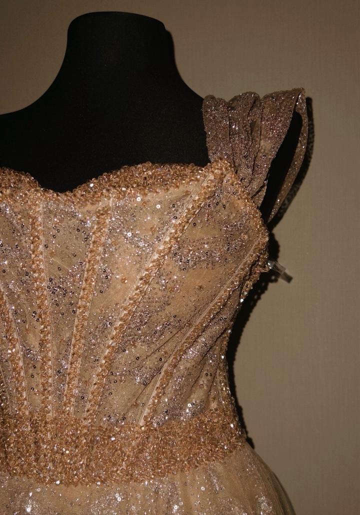 Роскошное вечернее платье Изысканное платье в нежном оттенке шампань. Корсетный верх подчёркивает фигуру, создавая утончённый силуэт, а мягкая юбка плавно струится, добавляя образу лёгкости.Платье выполнено из многослойного фатина с деликатным сиянием. Верх украшен ручной вышивкой бисером, пайетками и стеклярусом, которые красиво переливаются при свете, создавая эффект «искрящегося золота». Из нутри платье сшито из атласа очень приятное для тела. Корсет на завязках,на юбке есть замок,размер XS,S Артикул: 566858