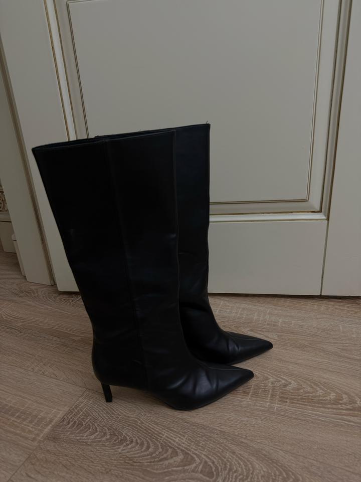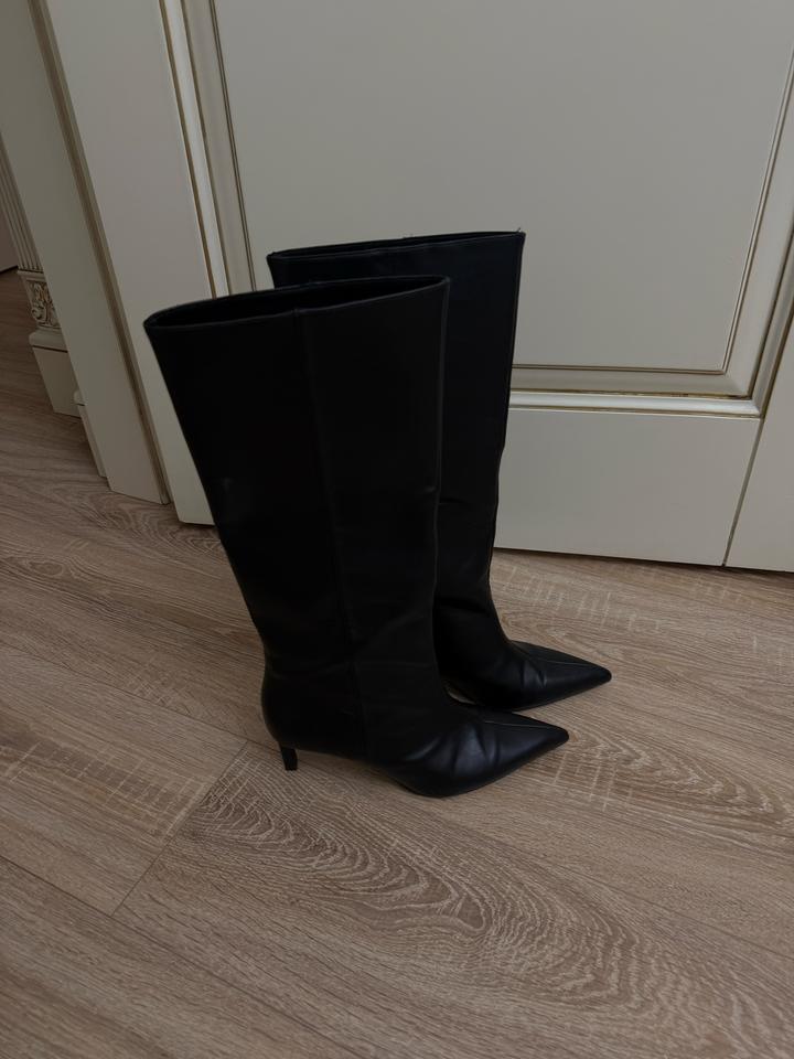 Стильные чёрные сапоги из гладкой экокожи 🤍 Элегантный заострённый нос придаёт образу утончённость и делает ноги визуально длиннее. Высокое голенище красиво садится по ноге, отлично сочетается как с юбками, так и с джинсами или платьями. ✨ Надевались всего 1 раз-состояние почти новое ✨ Размер: 39 ✨ Удобная посадка, аккуратный силуэт ✨ Универсальный базовый цвет подойдёт под любой гардероб Идеальный вариант на осень/весну для стильных образов) Артикул: 566890
