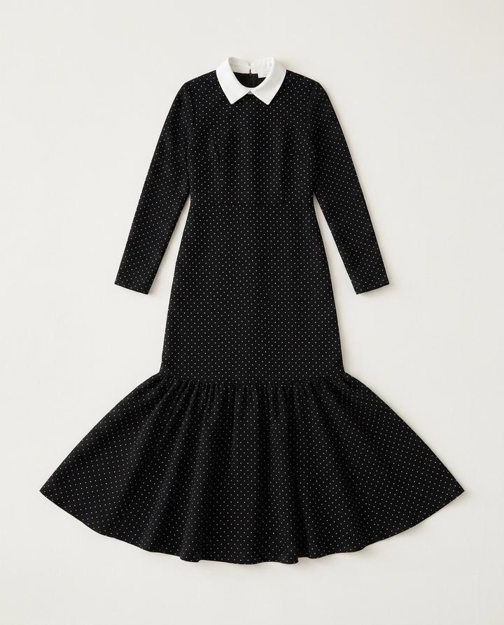 Элегантное чёрное платье в белый мелкий горошек с контрастным белым воротником. Модель выглядит очень женственно и аккуратно, подчёркивает талию и красиво расклёшивается книзу, создавая лёгкий, изящный силуэт. Длинный рукав делает платье универсальным для любого сезона, а лаконичный дизайн легко сочетается как с каблуками, так и с более повседневной обувью. Платье подойдёт для работы, прогулок, встреч и особых случаев. Стильное, удобное и очень эффектное. Артикул: 566987