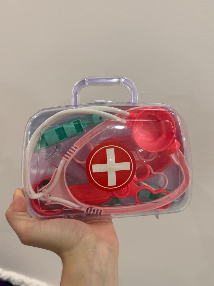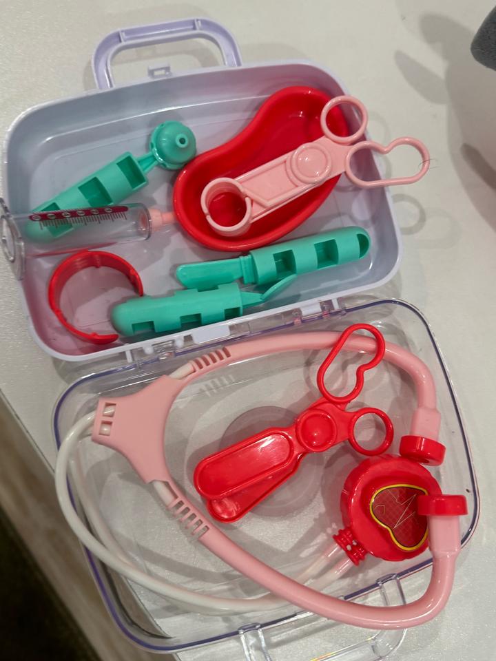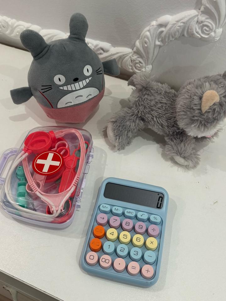 Все в идеальном состоянии (все как на фото) Толкар вертолетик со звуком и двигаются детальки (глаза, язык и винты сверху) Мягкий котик (в животе устоновлен звуковой механизм, небольшой, мяукает при нажатии 3 раза ) сам котик полностью мягкий (такой котик мало где найти) Канкулятор цветной с большими кнопками (ребенок долго с ним игралась) полностью работает 👍 Набор медика как на фото тоже интересная игра , ставит уколы и слушает сердце Артикул: 567088