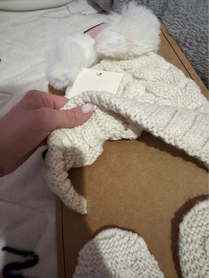 Шапка и варежки, размер 6-12мес На холодную осень/теплую зиму Помпоны съемные 80% акрил, 10% элит, 10% полиамид Артикул: 567512
