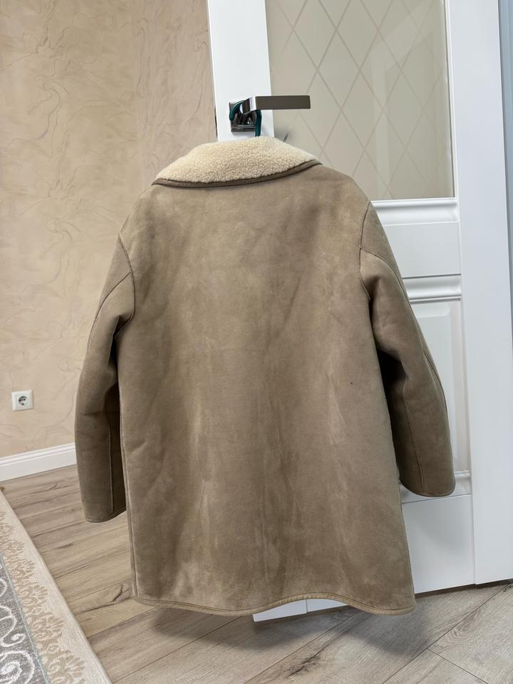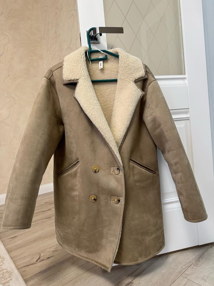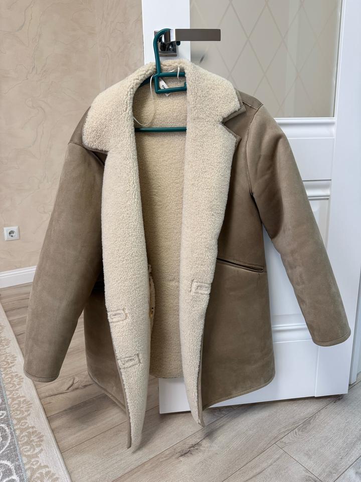 Женская дубленка Mango из искусственной кожи и меха. Модель имеет двубортный дизайн с четырьмя пуговицами, накладными боковыми карманами и отделкой из светлого искусственного меха («барашка») на воротнике и внутренней части. Свободный крой (oversize), широкие лацканы и косые прорезные карманы. Из дефектов, пуговица с внутренней стороны держится слабо, одна отвалилась. Артикул: 567839