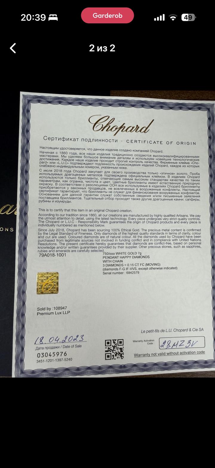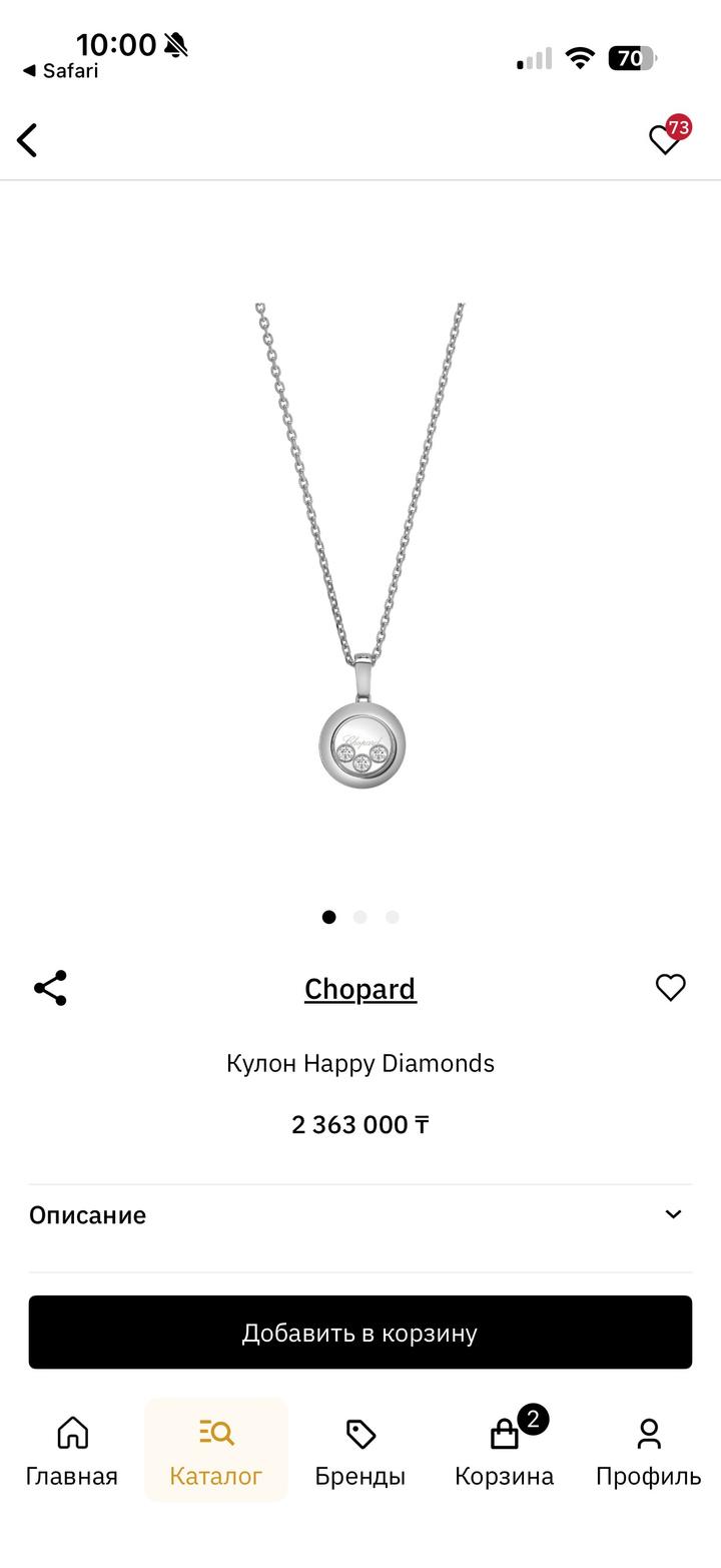 Подвеска Chopard плавающие бриллианты 3 шт, коробка пакет сертификаты. Оригинал, покупали в бутике Chopard в есентае. Реальному покупателю сделаю хорошую скидку 💵👌🏼 Артикул: 567943