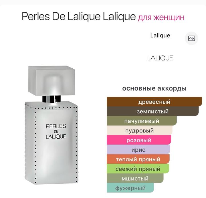 Perles De Lalique — это аромат для женщин, он принадлежит к группе шипровые цветочные. Perles De Lalique выпущен в 2006 году. Парфюмер: Nathalie Lorson. Верхняя нота: Роза; средние ноты: Перец, Ирис и Пудровые ноты; базовые ноты: Пачули, Дубовый мох, Ветивер, Корень ириса и Кашемировое дерево. Оригинал, без пары распылений, есть похожий, брала без затеста, есть чек о покупке. Артикул: 568142