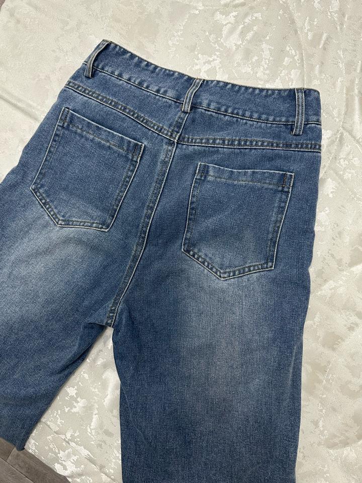 Фасон: Широкие, прямые от бедра. • Декор: Крупная рванина, контрастные лампасы. • Цвет: Синий деним. • Состояние: Отличное. Артикул: 568176