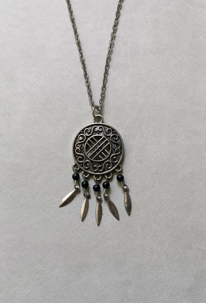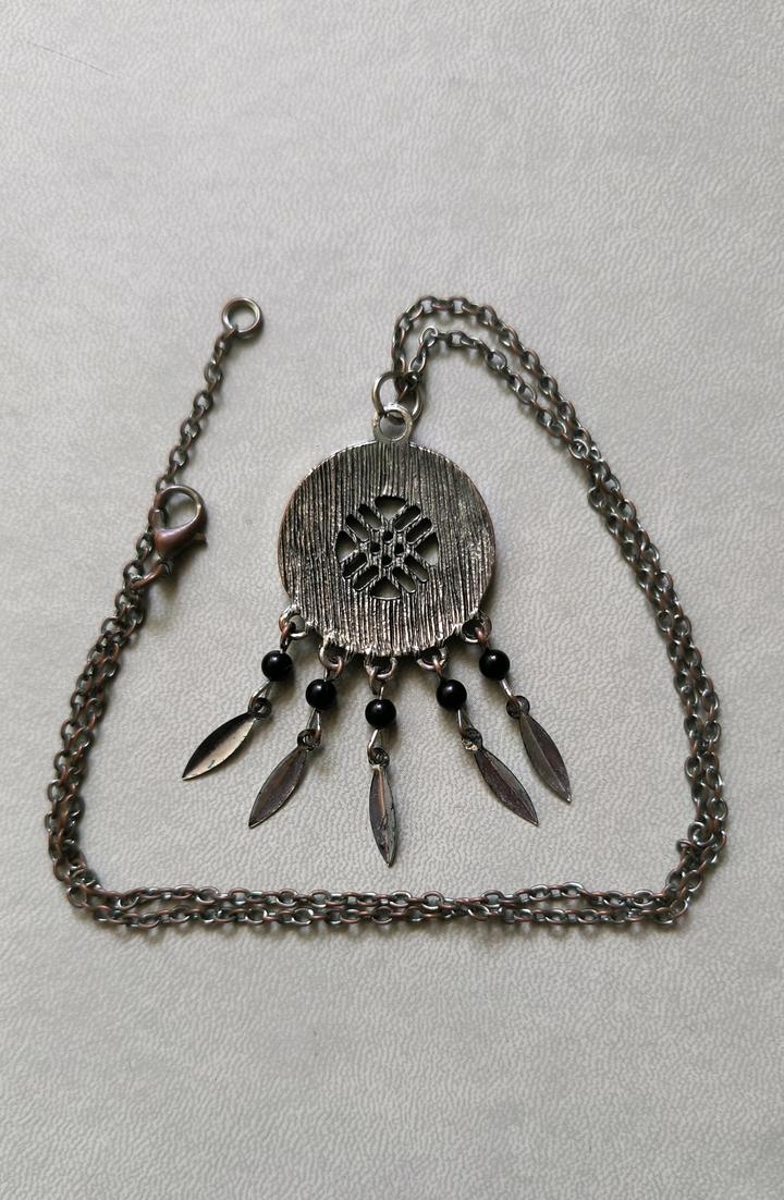 Изящная подвеска с чеканным орнаментом и черными декоративными вставками. Нижняя часть дополнена подвижными лепестками. Поверхность металла имеет мягкий винтажным финиш с эффектом патины. Стиль: Этно / Бохо. Застежка: Карабин. Артикул: 568269