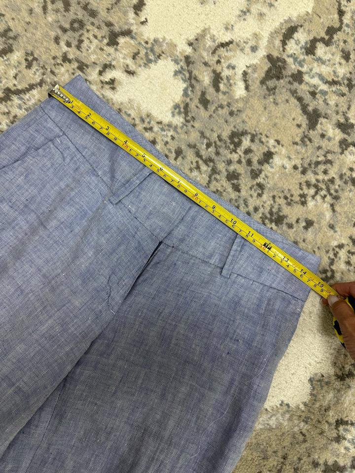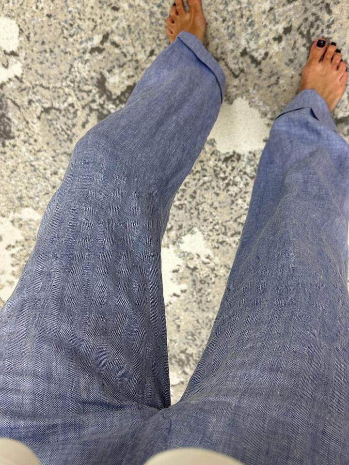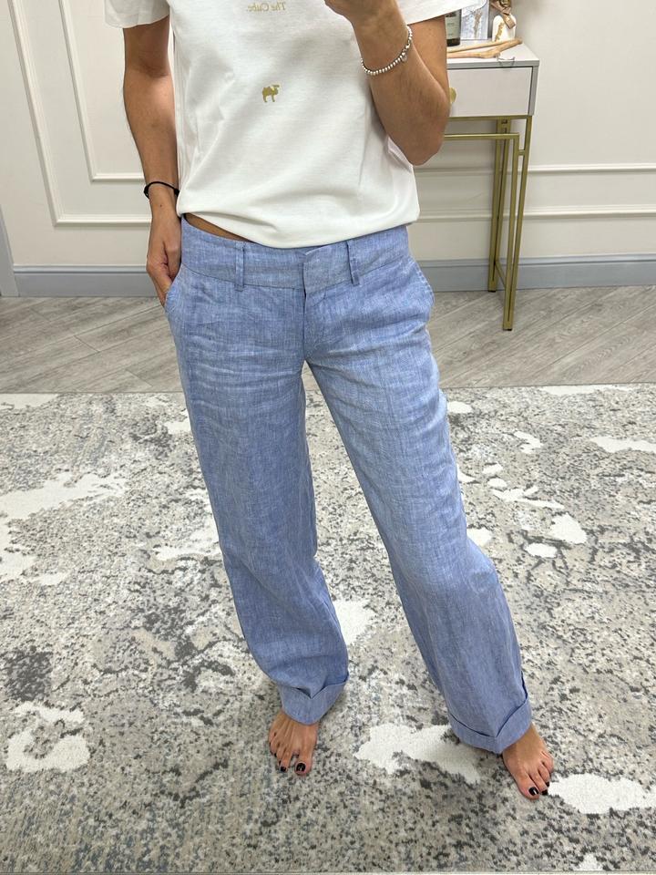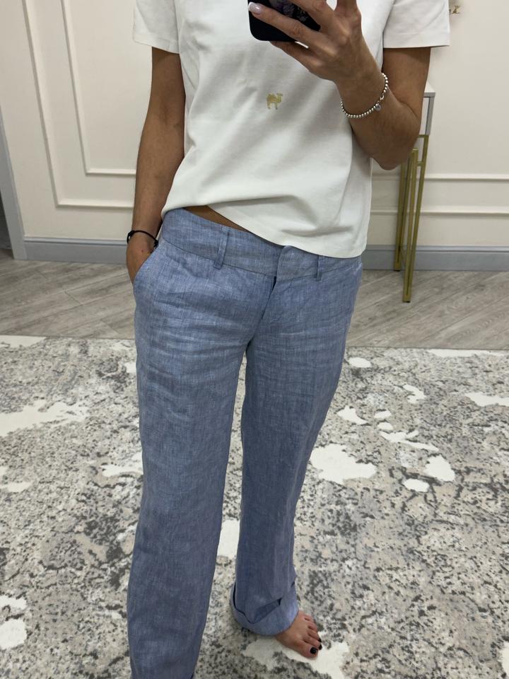 Голубые льняные брюки, размер 34, на хс-с. Низкая посадка, полная длина с подвернутым кантом. Фактурная ткань. Очень хорошее состояние. Коленки не вытягиваются. Артикул: 568433