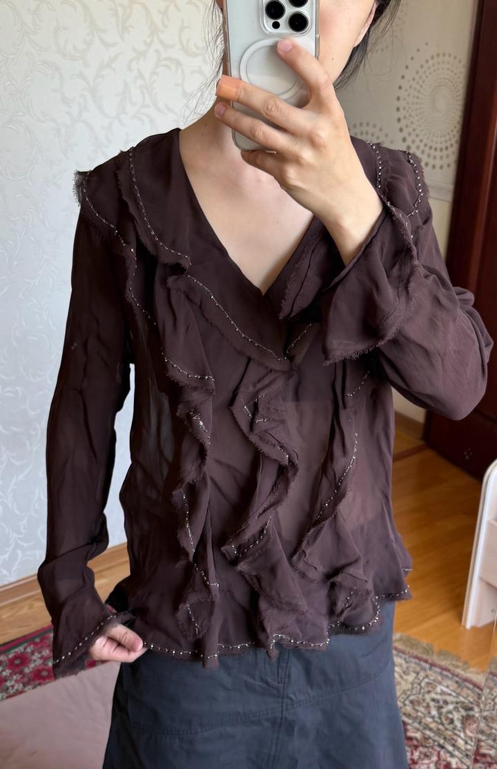 Блузка шоколадного оттенка, размер S, подойдет также на М (мой размер М), немного просвечивает. Артикул: 568831