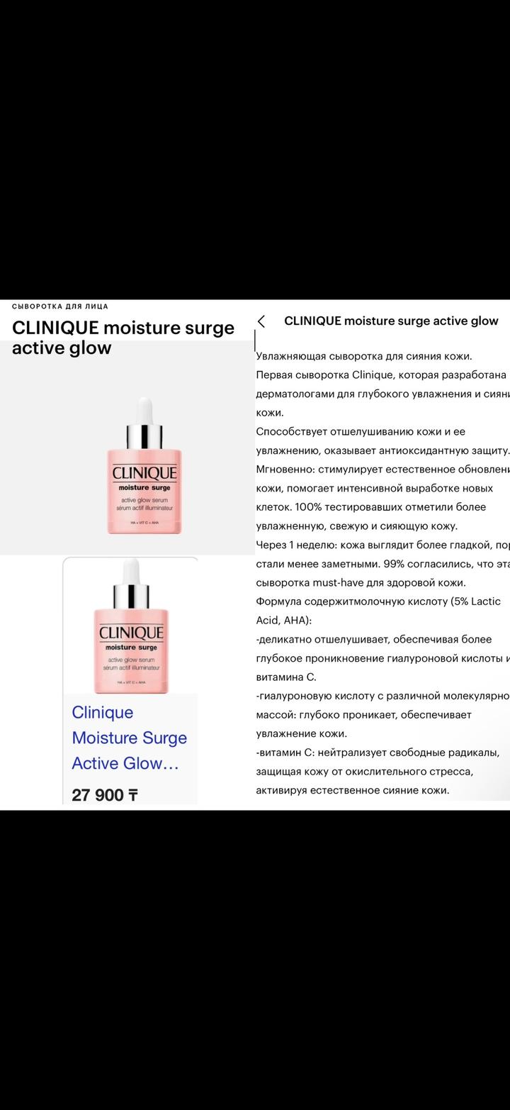 CLINIQUE moisture surge active glow Увлажняющая сыворотка для сияния кожи. Первая сыворотка Clinique, которая разработана дерматологами для глубокого увлажнения и сиян кОЖИ. Способствует отшелушиванию кожи и ее увлажнению, оказывает антиоксидантную защиту Мгновенно: стимулирует естественное обновлен кожи, помогает интенсивной выработке новых клеток. 100% тестировавших отметили более увлажненную, свежую и сияющую кожу. Через 1 неделю: кожа выглядит более гладкой, по стали менее заметными. 99% сог Артикул: 568948