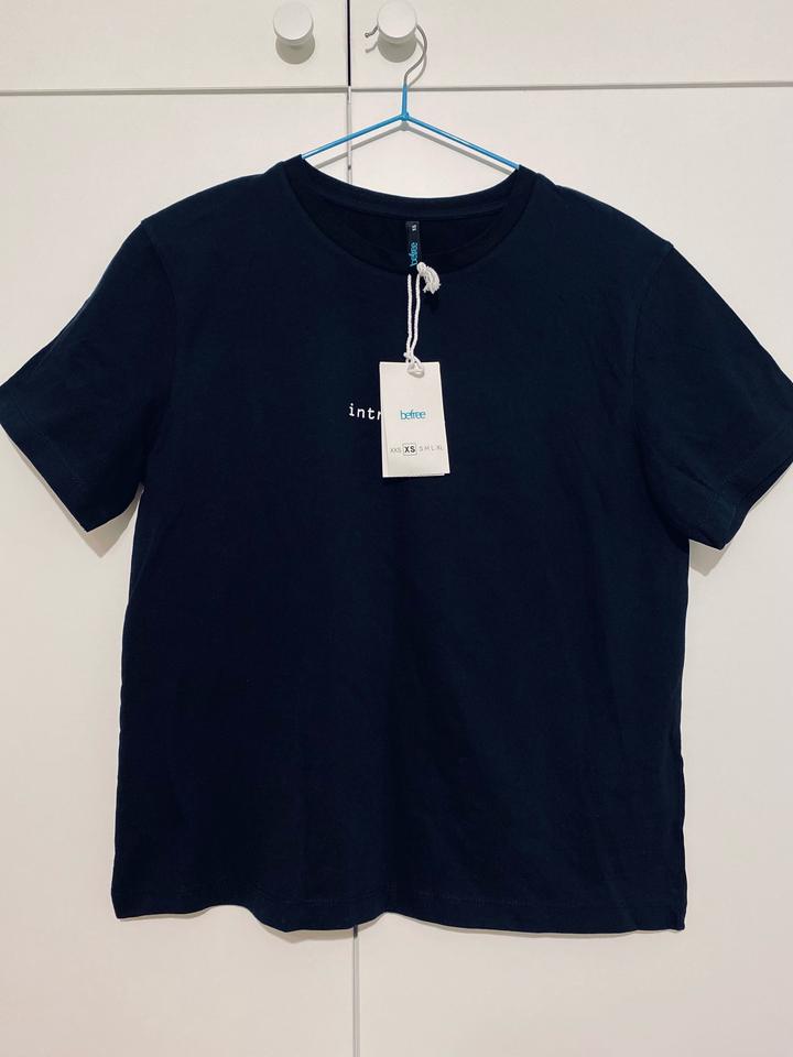 Футболка Befree, новая с этикеткой, черного цвета, с лаконичной надписью и свободного кроя. Универсальна для casual-образов. Размер XS, 100% хлопок. Артикул: 569023